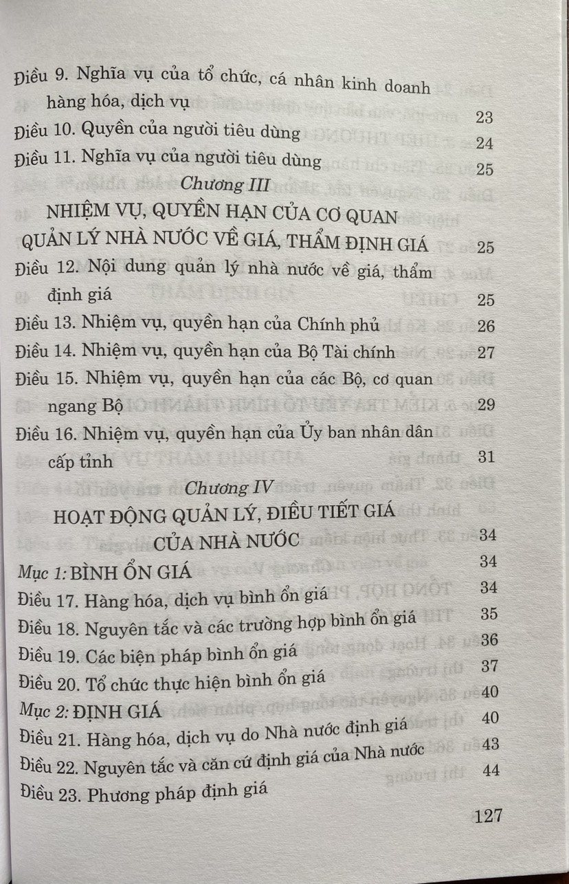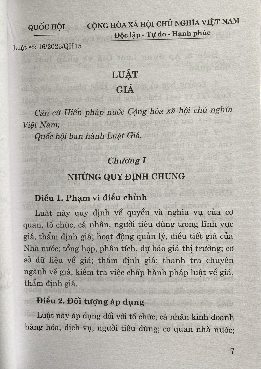Trên cơ sở đó, ngày 19/6/2023, tại kỳ họp thứ 5, Quốc hội khóa XV đã thông qua Luật Giá năm 2023, thay thế Luật Giá năm 2012. Luật gồm 8 chương, 75 điều, quy định về quyền và nghĩa vụ của cơ quan, tổ chức, cá nhân, người tiêu dùng trong lĩnh vực giá, thẩm định giá; hoạt động quản lý, điều tiết giá của Nhà nước; tổng hợp, phân tích, dự báo giá thị trường; cơ sở dữ liệu về giá; thẩm định giá; thanh tra chuyên ngành về giá, kiểm tra việc chấp hành pháp luật về giá, thẩm định giá. Luật có hiệu lực thi hành từ ngày 01/7/2024.