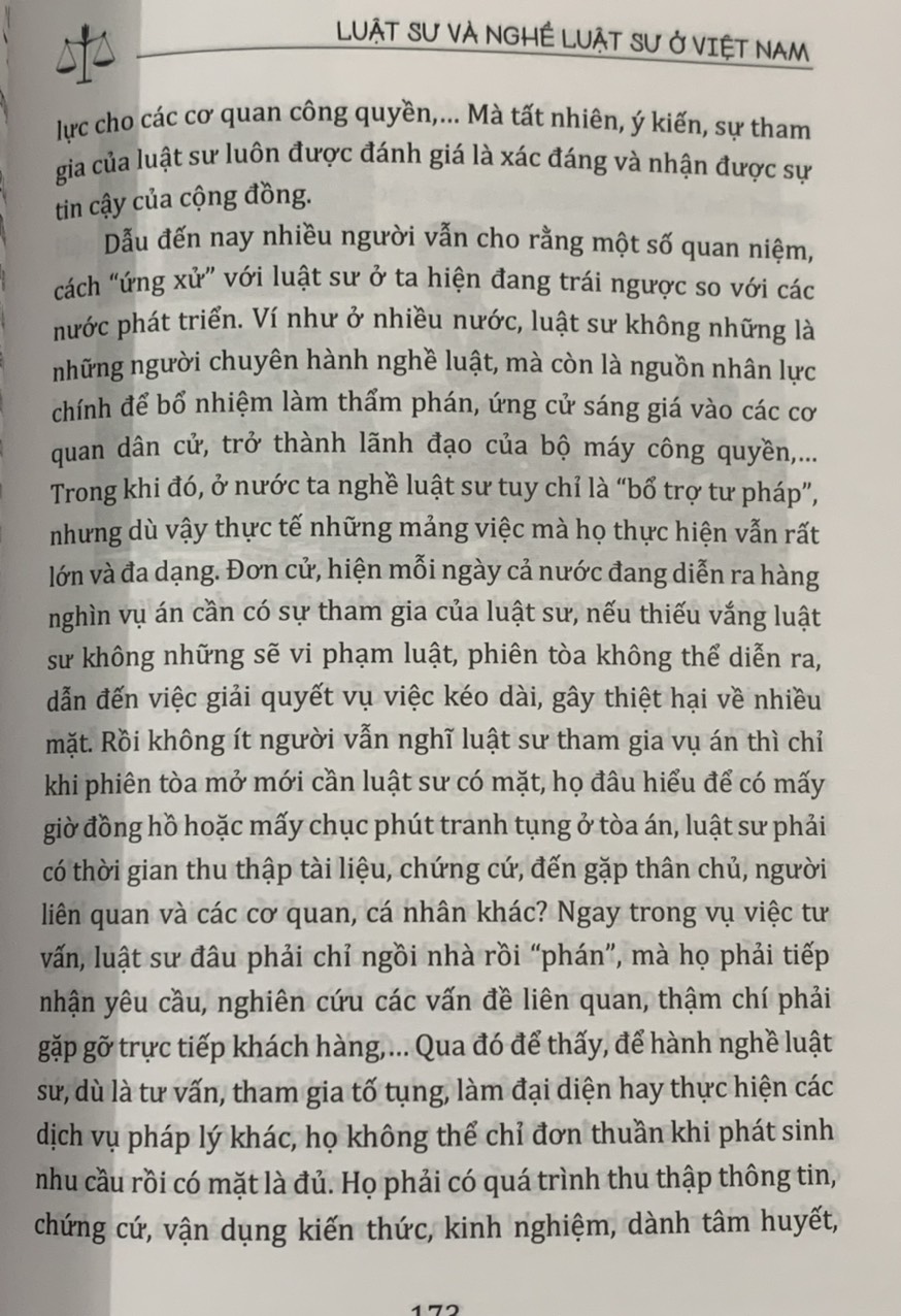 Vẫn biết, để phản ánh được hết các khía cạnh, công việc của nghề luật sư lúc này là điều không dễ, do đó “Luật sư và nghề luật sư ở Việt Nam” cũng khó tránh khỏi những hạn chế, thiếu sót nhất định. Nhưng bằng kinh nghiệm thực tế, cùng với việc dày công tìm tòi, nghiên cứu với cách thể hiện chân thực, dễ hiểu qua từng bài viết của tác giả, tin rằng cuốn sách sẽ mang đến cho người đọc nhiều thông tin tham khảo bổ ích, có giá trị về luật sư và nghề luật sư ở Việt Nam sau hơn một thế kỷ hoạt động.