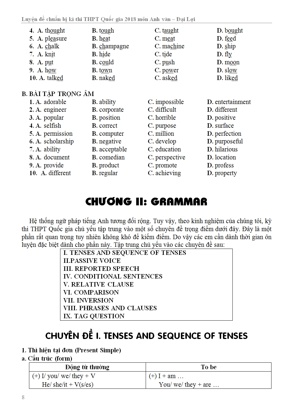 Cuốn sách bao gồm 3 chuyên đề lớn: Ngữ âm, Từ vựng và Ngữ pháp Trong mỗi chuyên đề lớn sẽ được chia thành các chủ đề bao gồm: Các kiến thức trọng tâm.