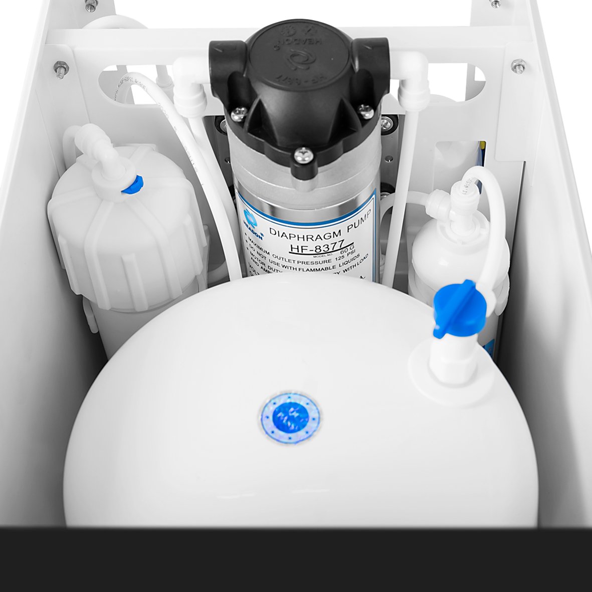 - Bước lọc số 4:Là Màng R.O Dow Filmtec được sản xuất từ Mỹ. Tách nước hoàn toàn khỏi các vật chất như: vi rút, vi khuẩn, kim loại nặng: thạch tín, chì, mangan, Amoni và các chất độc hại khác…có kích thước < 0.0001Micron. Cam kết nước đầu ra 100% tinh khiết và an toàn.