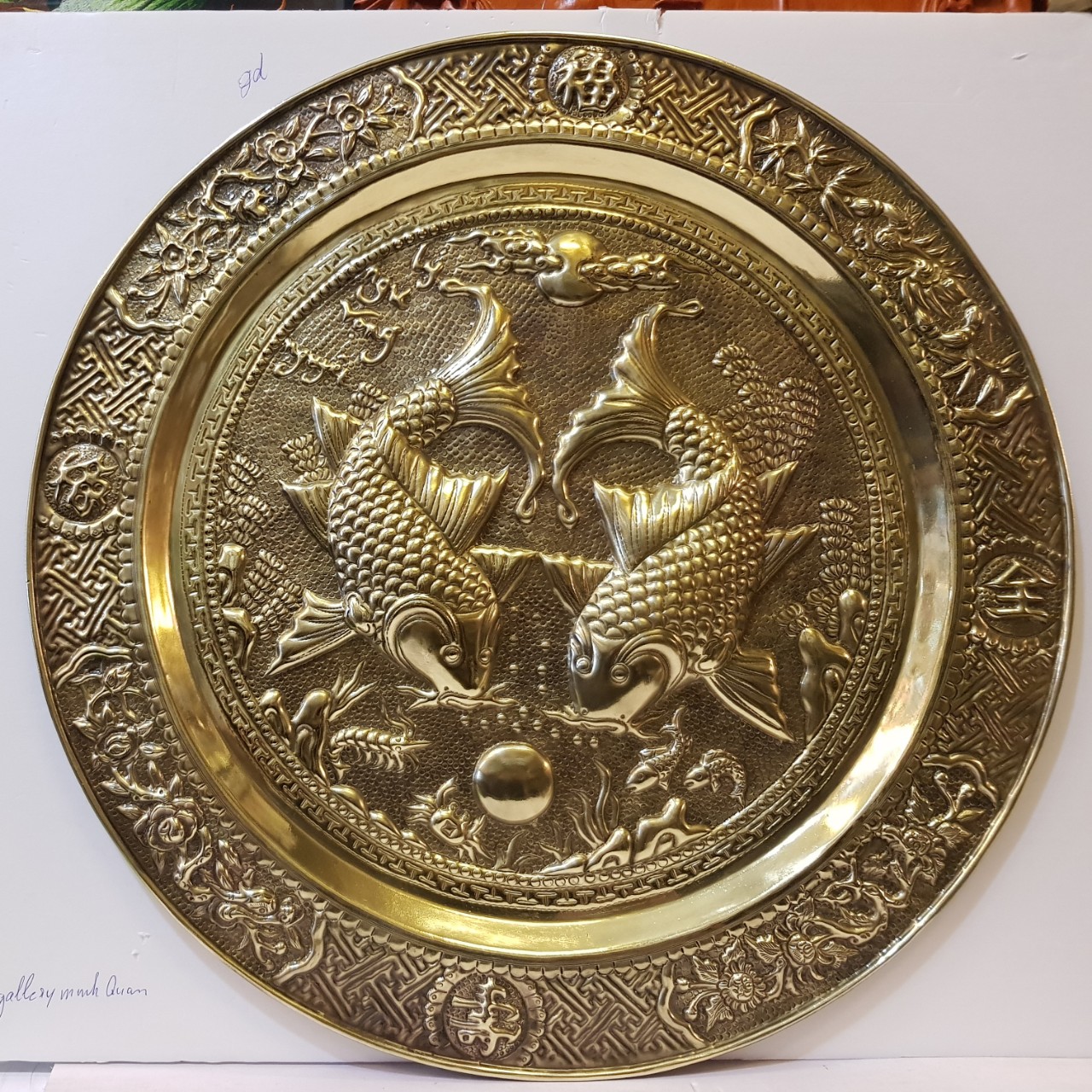 Mua tại TiktokMâm đồng vàng liền tấm thúc gò nổi – LÝ NGƯ VỌNG NGUYỆT ( CẶP CÁ CHÉP) Đồng vàng nguyên chất liền tấm dày 6 rem được thúc gò chạm khảm hoàn toàn thủ công cực tinh xảo.