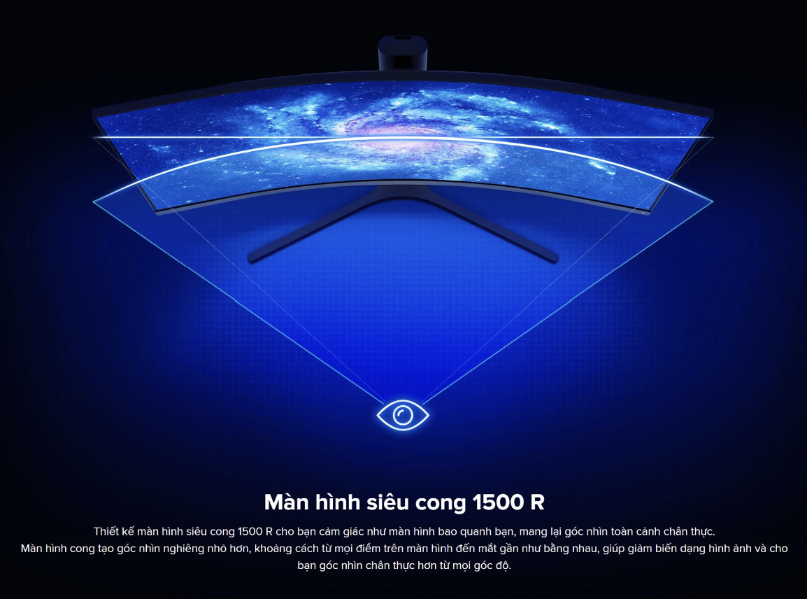 Thiết kế độ cong 1500R của Xiaomi Redmi Gaming Monitor G34WQ tạo cảm giác như được bao quanh bởi màn hình, cho bạn một cái nhìn toàn cảnh sống động. Màn hình cong tạo ra góc nghiêng hình ảnh nhỏ hơn, do đó mọi điểm trên màn hình đều cách xa mắt bạn gần như bằng nhau, giảm hiện tượng méo hình và cho bạn góc nhìn chân thực hơn.