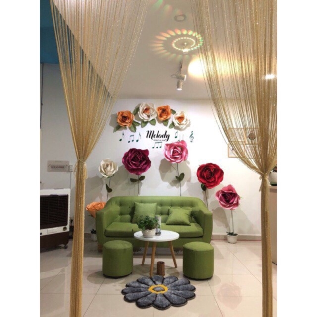 • Ví dụ: bạn mua 1 tấm rèm 3m sẽ làm được 1 rèm cửa 1m5-2m Rèm cửa sợi kim tuyến là một loại rèm được thiết kế độc đáo với các sợi kim tuyến lấp lánh, nổi bật được quấn xen vào sợi rèm dù làm cho không gian của bạn thêm bắt mắt, ấn tượng hơn.   Sợi rèm chất liệu dù bền đẹp thường được dùng làm rèm che chắn cửa ra vào, rèm trang trí cửa sổ, rèm ngăn phòng khách, rèm ngăn giường spa. Đặc biệt với những sợi nhỏ liti lấp lánh, loại rèm này còn được sử dụng nhiều trong trang trí phông rạp cưới  Rèm kim tuyến đã được dệt ống để bạn luồn thanh treo hoặc dây treo lên cửa   Rèm sợi kim sa sẽ đem đến vẻ đẹp lãng mạn cho không gian phòng ngủ, sang trọng và hiện đại cho không gian phòng khách. Ngôi nhà sẽ trở nên ấm áp và sang trọng hơn với bộ rèm sợi đính kim tuyến lấp lánh dưới ánh sáng điện. Không gian spa được trang trí với loại rèm này cũng sẽ tạo nên không gian nhẹ nhàng thư giãn   Thường để sợi rèm dày đẹp như mẫu bạn có thể đẩy thu nhỏ mỗi tấm còn khoảng 0.5m  sẽ tạo độ dày cho rèm nhé   Lưu ý: Rèm cửa kim tuyến là rèm trang trí không phải là rèm cản sáng hay rèm cản nắng Đa dạng mẫu trang trí với rèm cửa sổ kim sa: