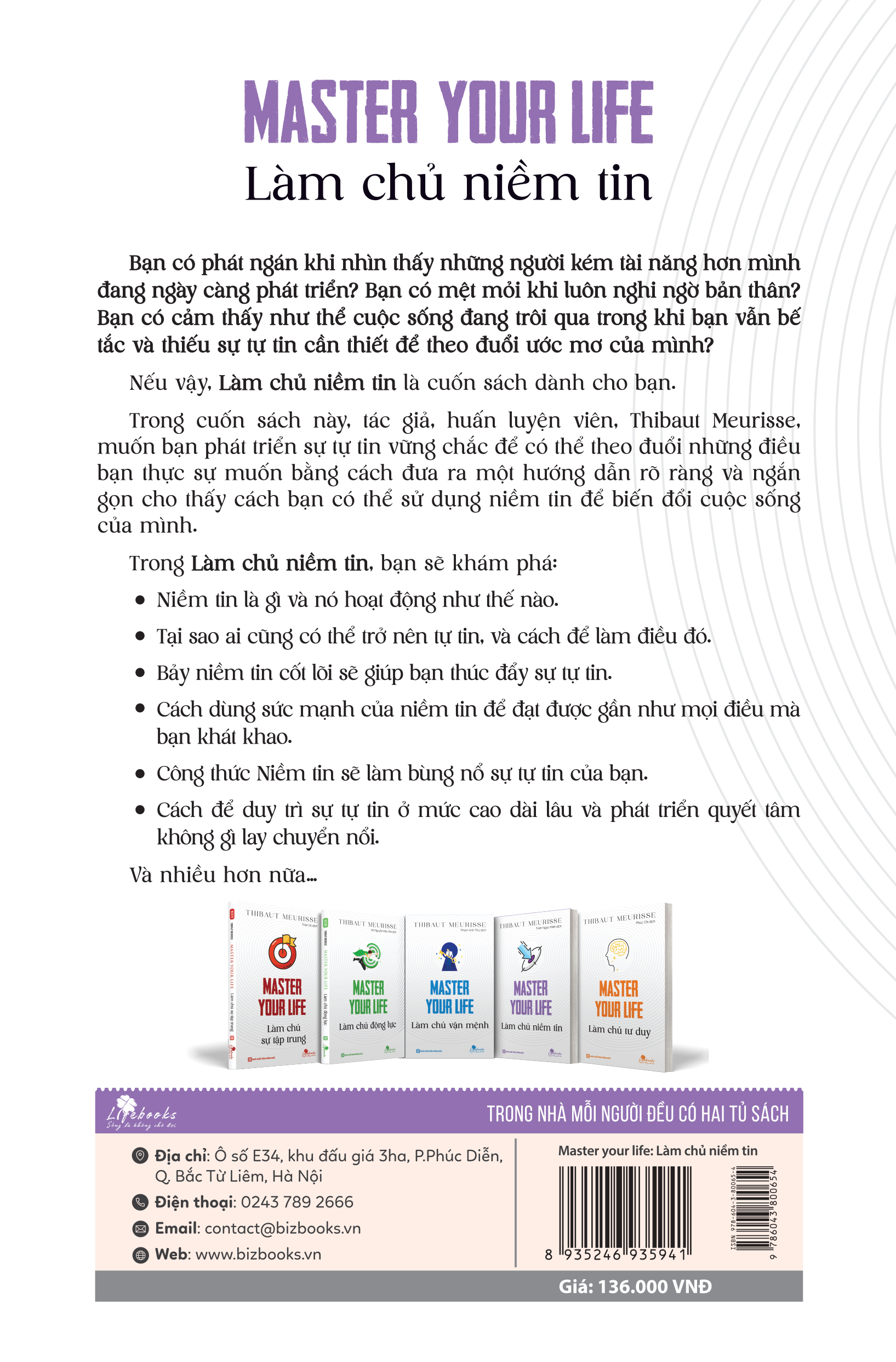 Master your life - Làm chủ niềm tin sẽ giúp bạn biết được cách niềm tin hoạt động, cũng như một công thức đặc biệt để phát triển sự tự tin bền vững. Hãy coi cuốn sách này như một hướng dẫn thực hành để xây dựng sự tự tin lớn hơn. Bằng cách áp dụng những bài tập chi tiết dưới mỗi chương/mục trong sách, bạn sẽ hoàn toàn cho phép mình sử dụng sức mạnh của niềm tin để đạt được những mục tiêu tham vọng nhất và sống cuộc đời như mong muốn - cuộc đời mà bạn xứng đáng.
