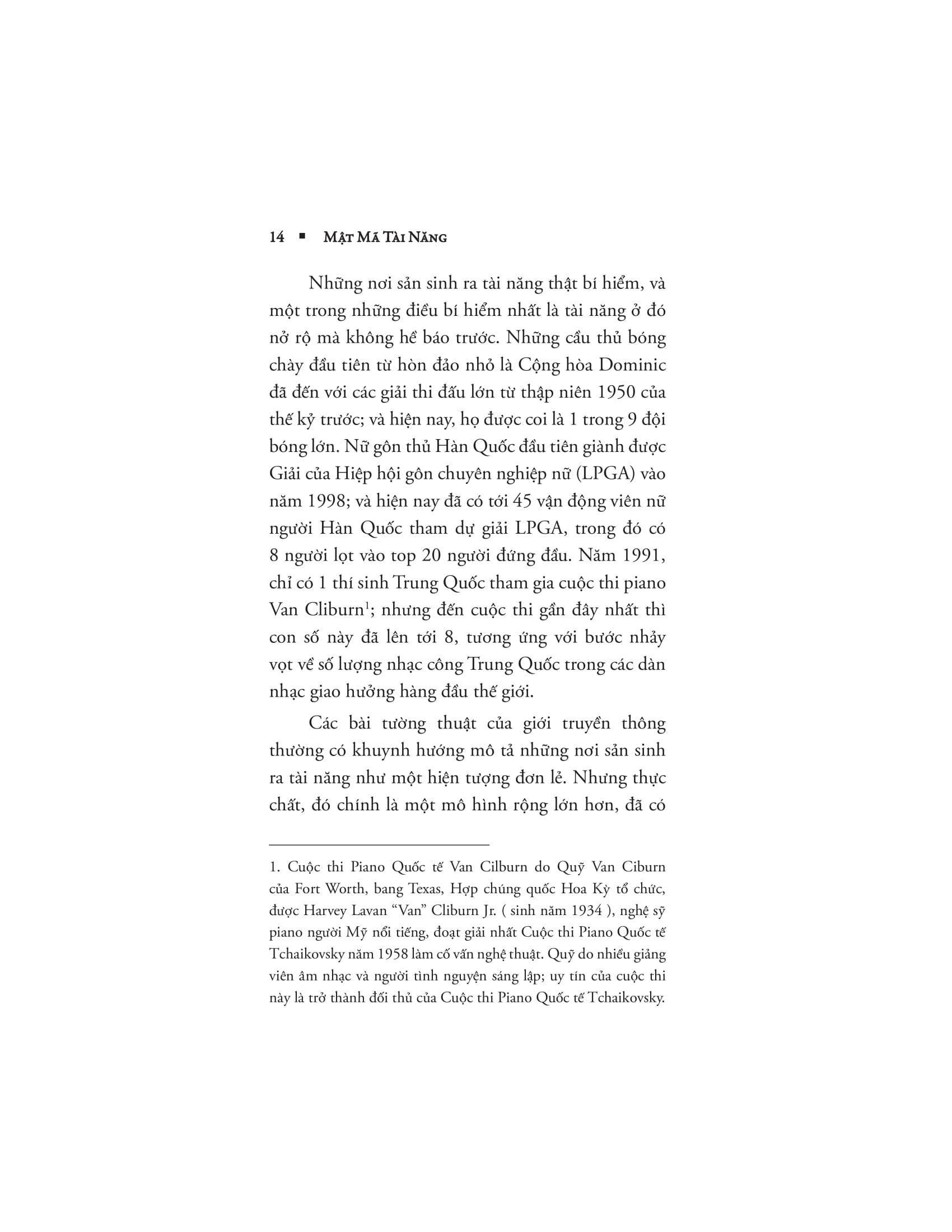 Mật Mã Tài Năng Bí mật của tài năng là gì? Chúng ta có thể khám phá nó ra sao? Trong cuốn sách đi sâu nghiên cứu này, nhà báo – tác giả có sách bán chạy nhất theo bình chọn của Thời báo New York – Daniel Coyle sẽ cung cấp cho các bậc phụ huynh, giáo viên, huấn luyện viên, doanh nhân – và mọi người khác nữa – các công cụ để có thể tận dụng tối đa các tiềm năng của chính bản thân và mọi người. Dù bạn đang huấn luyện cho một đội bòng bầu dục hay dạy một đứa trẻ chơi đàn piano, viết tiểu thuyết hay cố gắng cải thiện cú vung gậy trong môn bóng chày thì cuốn sách mang tính cách mạng này sẽ chỉ cho bạn biết cách nuôi dưỡng và phát triển tài năng thông qua việc khai thác và sử dụng một cơ chế mới được khám phá của não bộ. Dựa trên những thành tựu xuất sắc của ngành thần kinh học và nghiên cứu mới nhất trong quá trình đi tới 9 địa chỉ sản sinh ra rất nhiều tài năng của thế giới – từ sân bóng chày ở vùng Ca-ri-bê đến học viện âm nhạc cổ điển phía bắc New York – Coyle đã chỉ ra 3 yếu tố then chốt cho phép bạn phát triển tài năng và tối ưu hóa khả năng của m.ình trong các lĩnh vực thể thao, nghệ thuật, âm nhạc, toán học hay bất kỳ điều gì khác. +Tác giả: Daniel Coyle là tác giả của hai cuốn sách bán chạy nhất do Thời báo New York bình chọn, Cuộc chiến của Lance Armstrong và Bóng chày: Một mùa nằm trong dự án. Ông còn là biên tập viên góp ý cho Tạp chí Outside. Ông sống cùng vợ và 4 con tại Homer, bang Alaska. Đây cũng là nơi ông huấn luyện cho một đội bóng đang tiến bộ rất nhanh, Little League.