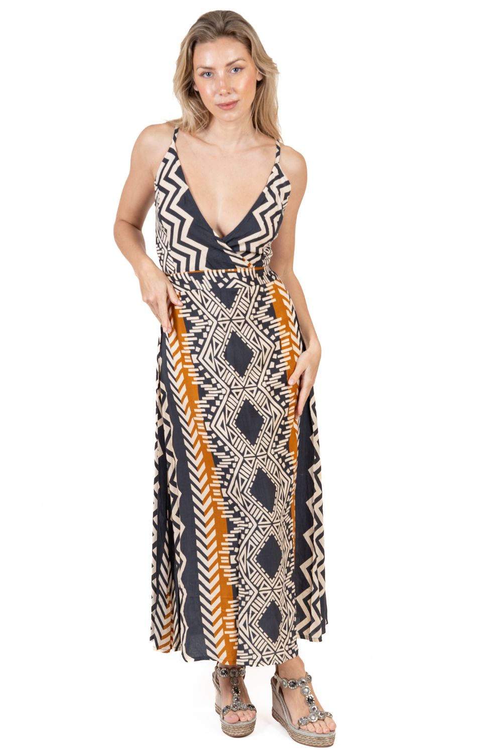 Maxi Boho Cotton Isla Bonita, chất liệu cotton cao cấp, mềm mại. Họa tiết thổ cẩm ấn tượng. Phom xòe rộng. Dài đầm 130cm (45x130) Phù hợp đi biển, dạo phố, công sở, hoặc dự