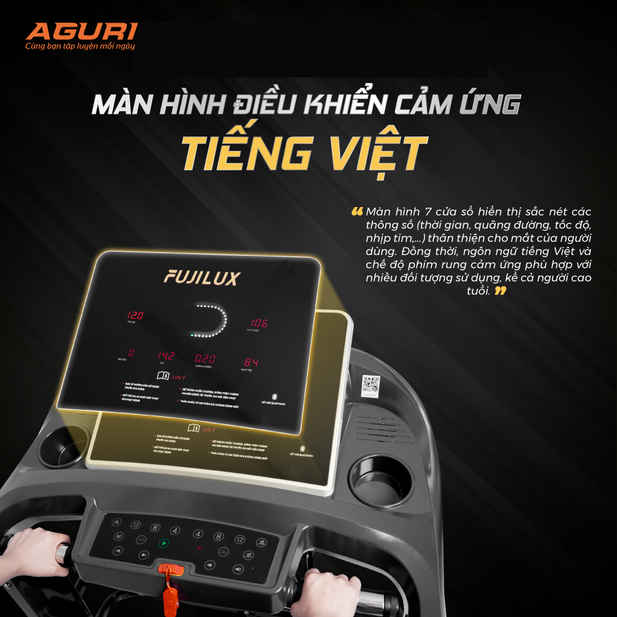 Máy chạy bộ AGURI AFT-368 - máy chạy bộ tại nhà Đây là máy chạy bộ chính hãng của thương hiệu AGURI - Máy tập của Cầu thủ Công Phượng. Là mẫu máy chạy bộ giá tốt được nhiều người tiêu dùng lựa chọn. Một mẫu máy chạy bộ gấp gọn dễ dàng, tiết kiệm không gian cho người dùng. > THÔNG SỐ KỸ THUẬT: - Motor DC công suất 4.0HP - Tốc độ: 0.8 km/h – 20.0 km/h - Chương trình mặc định: P1-P12 - Kích thước đặt máy (dài-rộng-cao): 1850*840*1450mm - Kích thước đóng thùng: 1920*900*380 mm - Diện tích băng tải: 510 x 1400 mm - Trọng lượng người dùng tối đa: 150 kgs - N.W/G.W: 103/113 kgs > MÔ TẢ SẢN PHẨM: - Màn hình LED 7 cửa sổ hiển thị thời gian, quãng đường, tốc độ, nhịp tim, độ dốc, calories, chương trình mặc định - Máy có piston thủy lực nâng đỡ, có thể gập gọn máy khi không sử dụng - Máy có 4 bánh xe di chuyển rất dễ dàng - Máy được trang bị 1 đầu massage, đánh mỡ bụng ; bộ phận gập bụng - Có hệ thống giảm sóc khi hoạt động, kết nối Bluetooth, hệ thống 2 loa stereo - Có chức năng đo chỉ số cơ thể (Body fat) > CHÍNH SÁCH BẢO HÀNH, BẢO TRÌ: - Bảo hành chi tiết máy lên tới 5 năm. Cụ thể: