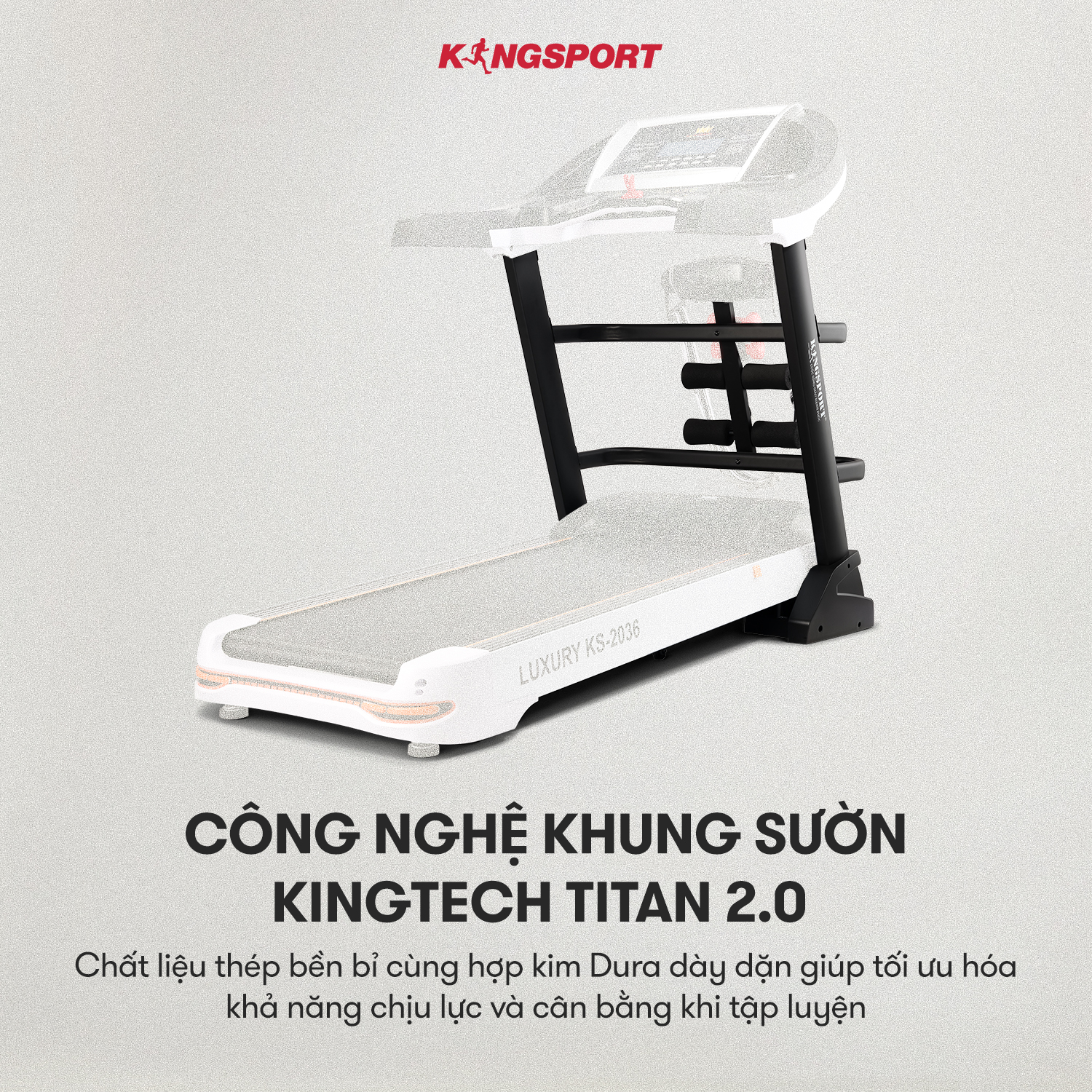 Khung sườn của máy chạy bộ được thiết kế to khỏe chắc chắn cho tải trọng máy khủng đến 150kg, đây là tải trọng thích hợp cho nhiều vóc dáng tập luyện khác nhau. Đặc biệt là những ai mong muốn một chiếc máy chuyên nghiệp như phòng Gym KS2036 chính là trải nghiệm tuyệt vời.