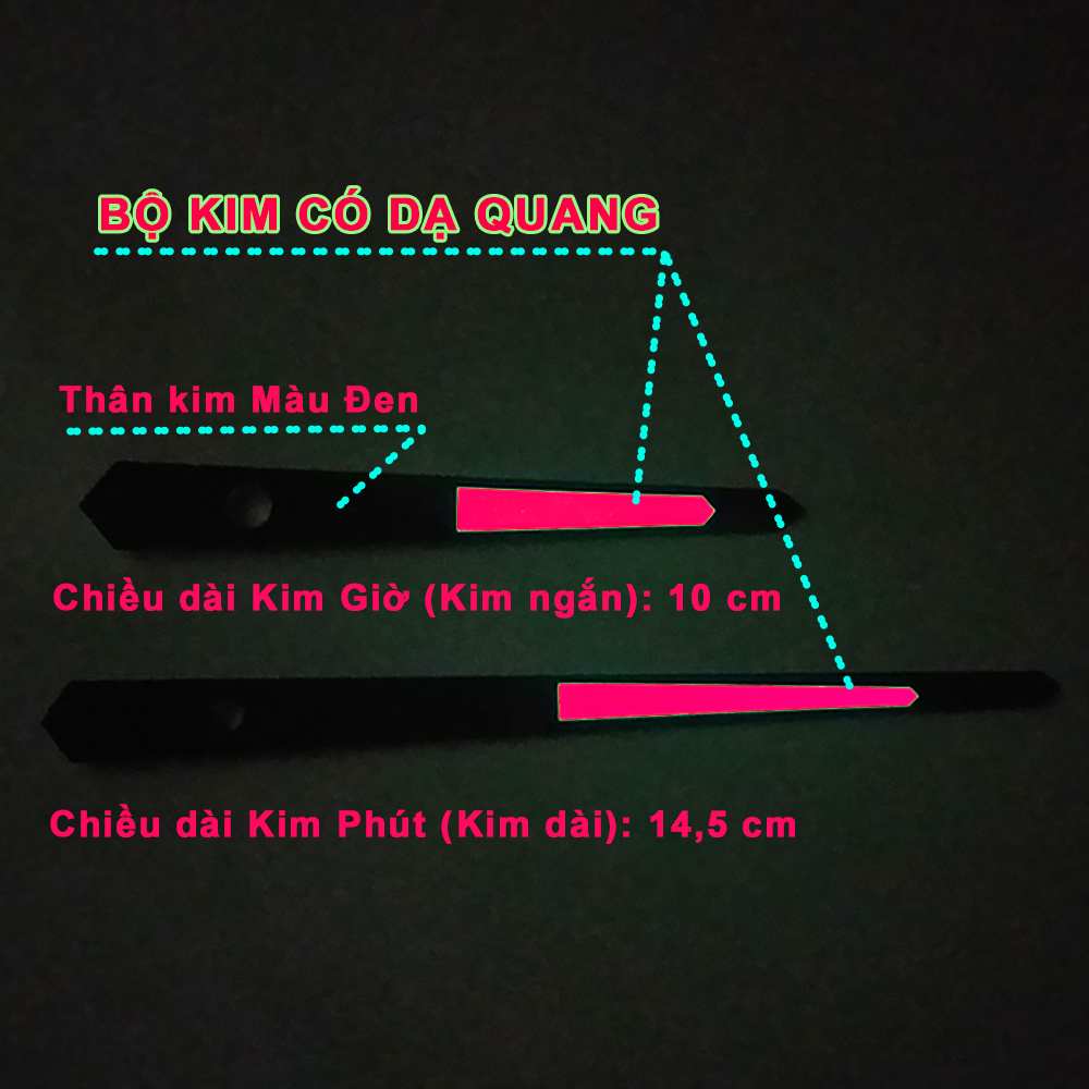 - Chiều dài bộ kim (toàn bộ): Kim Giờ: 10,5 cm; Kim Phút: 14 cm, Kim Giây: 14,5 cm.