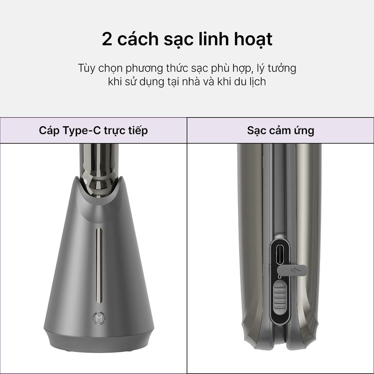 ĐÈN BÁO SẠC: Hệ thống đèn chỉ báo sạc được bố trí trên cả đế sạc và thân máy, giúp người dùng dễ dàng nhận biết và theo dõi tình trạng sạc pin một cách rõ ràng, đảm bảo kiểm soát quá trình sạc thuận tiện và chính xác.