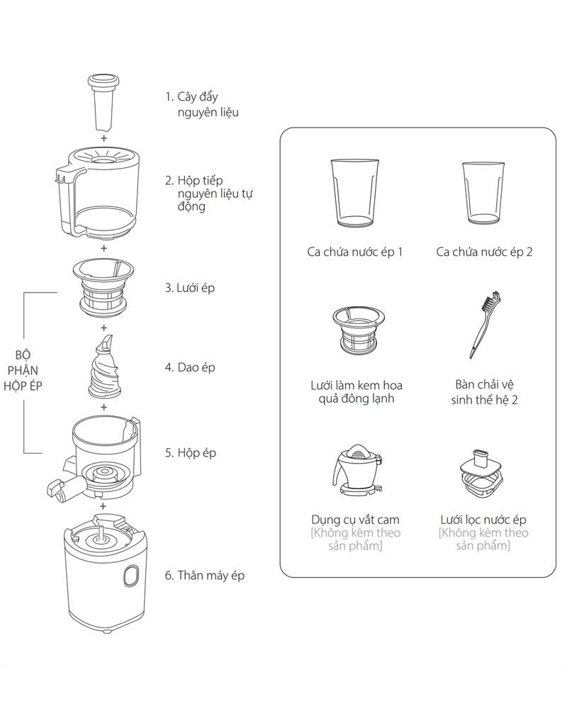 1. Dung tích hộp tiếp nguyên liệu lớn 1.7L  (57.4oz) Dung tích hộp tiếp nguyên liệu lớn 1.7L, bạn có thể ép nhiều nguyên liệu cùng lúc, giúp loại bỏ nhu cầu thêm nguyên liệu liên tục và tiế...