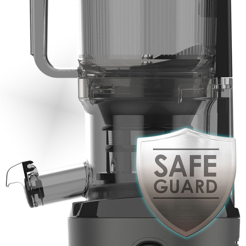 Một thiết bị an toàn 3 lớp được áp dụng để đảm bảo hoạt động chỉ khi nắp hộp tiếp nguyên liệu, hộp tiếp nguyên liệu và hộp ép được lắp đặt đúng cách. Nếu nắp hộp tiếp nguyên liệu tự động mở trong khi đang hoạt động, thì máy sẽ tự động ngừng lại.