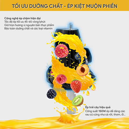 ƯU ĐIỂM SẢN PHẨM: - Động cơ 100% bằng đồng mạnh mẽ và bền bỉ - Công suất cực lớn 250W giúp nghiền nát các nguyên liệu cứng - Tốc độ ép