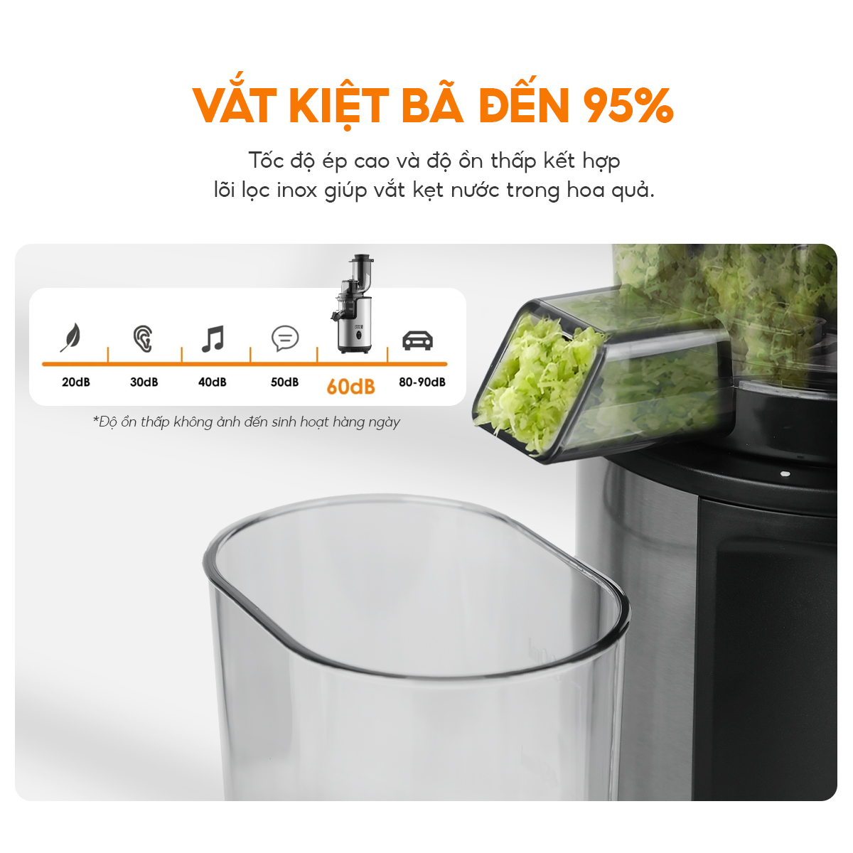 - Công suất 200W, động cơ DC bền bỉ ép kiệt bã lên đến 95%