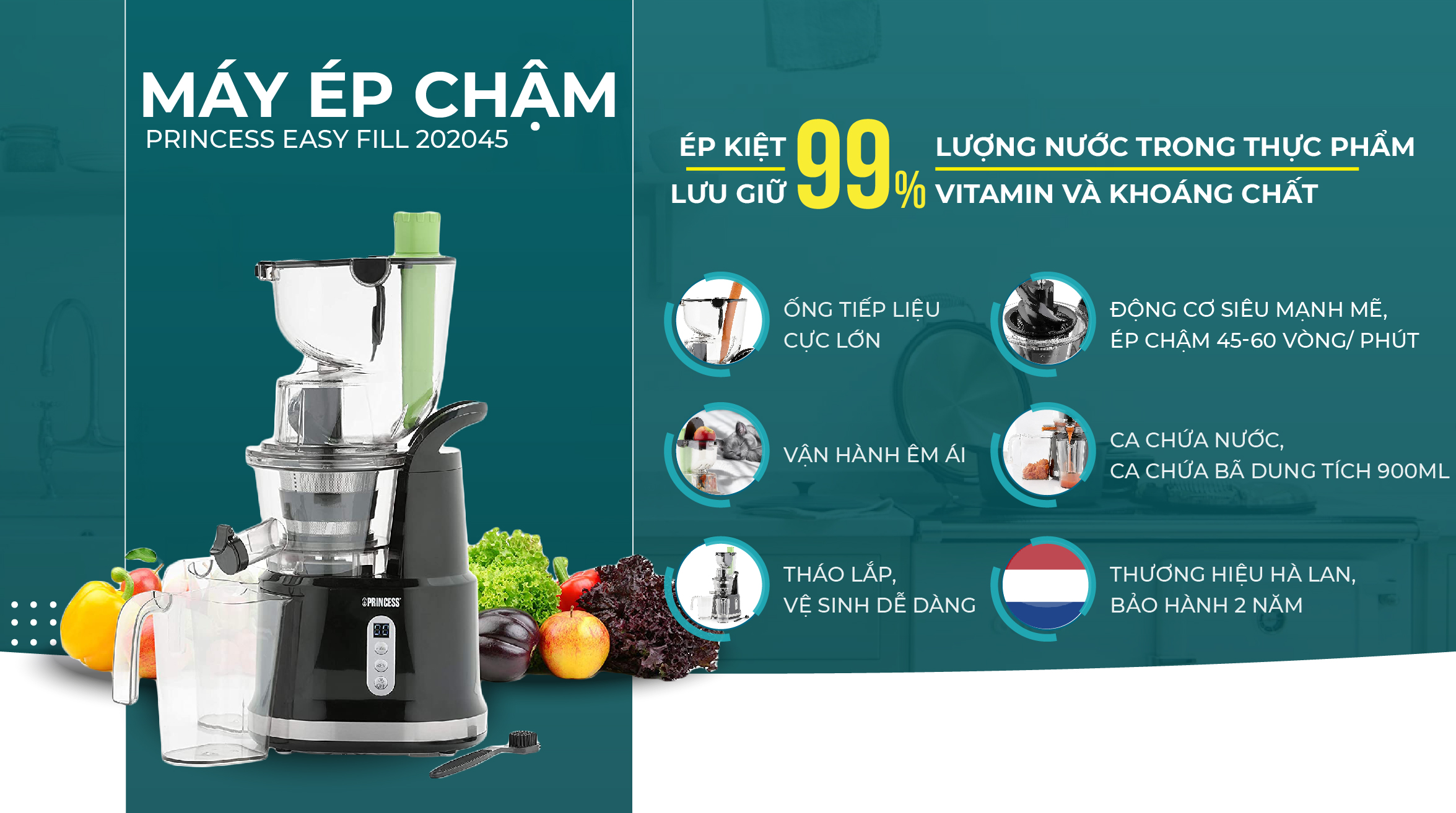 Sử dụng máy ép chậm Princess Easy Fill 202045, bạn có thể ép kiệt 99% lượng nước trong thực phẩm, lưu giữ 99% vitamin và khoáng chất, vượt trội hoàn toàn so với các loại máy ép khác trên thị trườngỐ...