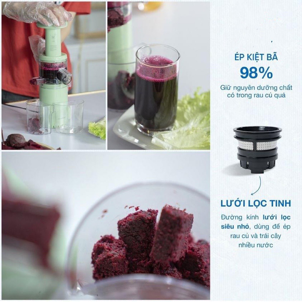 Tên sản phẩm - Máy ép chậm Mini Tính năng sản phẩm : - Thiết kế tính tế nhỏ gọn, sang trọng - Sử dụng đông cơ siêu êm khỏe ép được tất cả củ