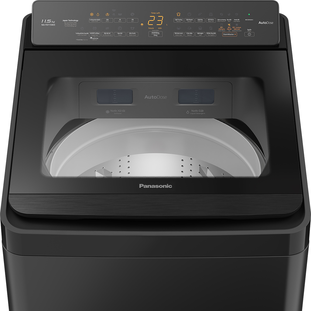 Thông số kỹ thuật Model: NA-FD115W3BV Màu sắc: Đen Nhà sản xuất: Panasonic Xuất xứ: Việt Nam Năm ra mắt : 2023 Thời gian bảo hành: 24 Tháng     Loại máy giặt: Cửa trên Khối lượng giặt: 11.5 kg Chế độ giặt: 14 chương trình   Trải nghiệm giặt giũ thảnh thơi với hàng loạt công nghệ thông minh Máy giặt Panasonic Inverter 11.5 kg NA-FD115W3BV là dòng máy giặt cửa trên thông minh giúp công việc giặt giũ của bạn giờ đây trở nên dễ dàng hơn bao giờ hết. Bạn chỉ cần cho đồ giặt vào và công nghệ AI Smart Wash sẽ giúp bạn các phần còn lại, từ việc phân bổ nước giặt và xả đến việc chọn chế độ giặt phù hợp với khối lượng quần áo. Máy giặt còn tự động tối ưu hóa các chu trình giặt để mang lại hiệu quả tốt nhất, giúp bạn giản đơn hóa quá trình giặt giũ. Ngoài ra, máy còn tích hợp nhiều công nghệ mang điến tiện nghi tối đa như: TD Inverter tiết kiệm điện; giặt hơi nước khử mùi diệt khuẩn tới 99.99%; công nghệ giặt lưu hương cho quần áo thơm ngát; tính năng tự động vệ sinh lồng giặ Chiếc máy giặt này hứa hẹn sẽ là trợ thủ đắc lực giúp công việc giặt giũ vốn nặng nhọc và tốn nhiều thời gian giờ đây lại hóa dễ dàng hơn bao giờ hết. Cảm biến ECONAVI tự động tối ưu chu trình giặt Máy giặt Panasonic trang bị cảm biến ECONAVI giúp đo khối lượng quần áo và nhiệt độ nước. Sau đó tự động điều chỉnh mực nước, lượng nước giặt và thời gian giặt phù hợp dựa trên nhu cầu giặt, giúp bạn tiết kiệm chi phí cho mỗi lần giặt. Bạn không phải sợ sử dụng quá nhiều nước khi giặt ít quần áo và ngược lại nữa, mà máy sẽ giúp bạn cân chỉnh đủ lượng chất tẩy, lượng nước, thời gian giặt sao cho mang lại hiệu quả giặt sạch mà vẫn đảm bảo tiết kiệm. Tự phân bổ chất tẩy AutoDose, đổ 1 lần dùng cả tháng Tính năng AutoDose tự động phân bổ lượng nước giặt và nước xả vải phù hợp, hạn chế sự lãng phí & giúp giảm bớt việc đong đếm thủ công. Từi nay, bạn không cần phải đau đầu cân - đo - đong - đếm lượng chất tẩy nữa, tránh tình trạng dùng quá nhiều hoặc quá ít. Đặc biệt, ngăn chứa nước giặt xả có dung tích lớn để bạn chỉ cần đổ đầy 1 lần nhưng dùng tối đa lên đến 1 tháng.  **AutoDose không áp dụng cho chương trình Tub Hygiene và Air Dry. Có thể giặt đến 1 tháng với trung bình 4-5 lần giặt một tuần. Giặt hơi nước loại bỏ đến 99,99% vi khuẩn Tính năng StainMaster+ kết hợp hiệu quả giữa hơi nước và nước nóng ở nhiệt độ 60°C giúp loại bỏ đến 99.99% vi khuẩn. Sự kết hợp này không chỉ đảm bảo quần áo của gia đình bạn luôn sạch khuẩn mà còn giúp tiết kiệm năng lượng, nước và thời gian. Đồng thời, tính năng này cũng hướng tới tạo ra một môi trường bền vững trong quá trình giặt quần áo của bạn. TD Inverter tiết kiệm điện, hiệu suất giặt mạnh mẽ Trải nghiệm giặt sạch hơn với xoáy nước mạnh mẽ Water Bazooka giúp dễ dàng loại bỏ các vết bẩn khó. Tính năng này được hỗ trợ bởi công nghệ TD Inverter, cho phép tăng công suất lên gấp 6 lần, đem lại hiệu quả giặt và xả vượt trội trong khi tiêu thụ năng lượng ít hơn. Hệ thống ActiveFoam tạo bọt siêu mịn, tăng cường giặt sạch Hệ thống ActiveFoam tích hợp trong máy giặt giúp tan chất tẩy hoàn toàn, tạo ra bọt mịn và đậm đặc. Bọt này len lỏi và thẩm thấu sâu vào từng sợi vải giúp loại bỏ bụi bẩn cho quần áo của bạn được giặt sạch hơn. Chế độ giặt lưu hương giữ quần áo luôn thơm ngát Tính năng giặt lưu hương được thiết kế để tối ưu hóa chu trình ngâm và xả, giúp quần áo giữ mùi thơm lâu hơn. Khi kích hoạt tính năng này, máy giặt sẽ sử dụng các phương pháp đặc biệt để làm cho quần áo thơm hơn và giữ hương lâu hơn sau quá trình giặt. Điều này giúp tạo ra trải nghiệm thú vị và tươi mới cho quần áo của bạn sau mỗi lần giặt. Nắp kính cường lực chống sập đảm bảo an toàn Máy giặt có nắp cửa không viền được làm từ vật liệu kính cường lực giúp bạn dễ quan sát chu trình giặt và mang tính bền chắc khi cho khả năng chịu tải cao. Đặc biệt, cửa được thiết kế với cơ chế chống sập, nên sẽ đóng lại một cách chậm rãi và nhẹ nhàng, tránh gây giật mình, tránh kẹt tay và hạn chế hư hỏng nắp máy.