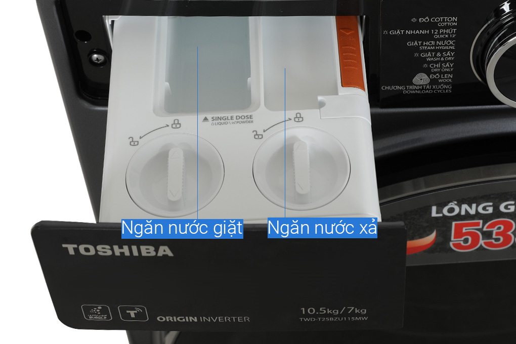 - Lồng giặt được làm bằng thép không gỉ bền bỉ, có độ sáng bóng cao và đảm bảo hiệu quả giặt sạch quần áo sau khi giặt. Đặc biệt, lồng giặt của Toshiba Inverter TWD-T25BZU115MWV(MG) được thiết kế với đường kính đến 535mm, rộng nhất so với các máy giặt Toshiba khác. Nhờ đó, máy giặt có khả năng giặt sạch hiệu quả và giảm hiện tượng nhăn quần áo tối ưu. *Hình ảnh chỉ mang tính chất minh họa Khối lượng giặt và chương trình giặt