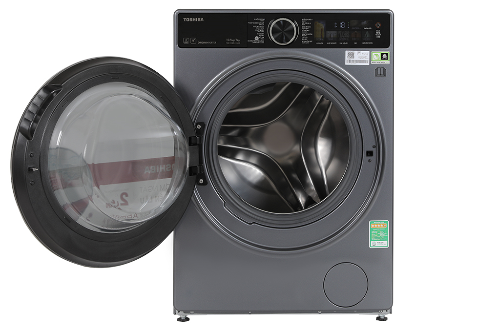 - Máy giặt sấy Toshiba Inverter TWD-T25BZU115MWV(MG) thuộc dòng máy giặt lồng ngang, sở hữu gam màu xám đậm nên dễ dàng phối hợp với các nội thất khác bên trong khu vực giặt giũ của gia đình bạn.