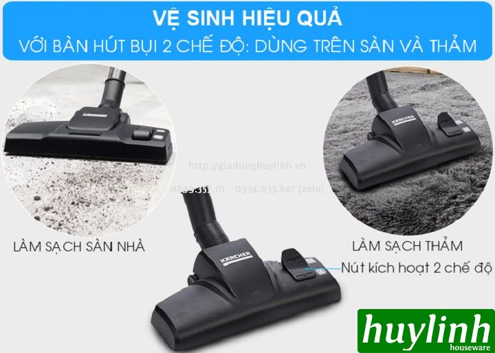 - Bàn hút bụi Karcher VC 3 Plus được thiết kế thông minh 2 trong 1, bao gồm chế độ chuyên làm sạch sàn trơn và chế độ chuyên làm sạch cho bề mặt thảm. Vận hành êm ái