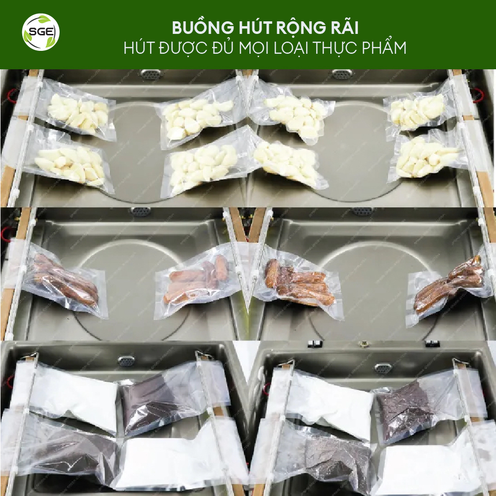 - Trang bị bánh xe, giúp di chuyển thuận tiện. MUA MÁY ÉP CHÂN KHÔNG KIỂU BUỒNG VCC03-C (HÚT CHÂN KHÔNG) KIỂU BUỒNG, MẪU VCC03 ĐƯỢC THIẾT KẾ VỚI KÍCH THƯỚC LỚN, THÍCH HỢP SỬ DUNG CHO NHIỀU LOẠI THỰC PHẦM NHƯ: ĐỒ KHÔ, ƯỚT, LOẠI THỰC PHẨM CÓ DẠNG BỘT, CÁC LOẠI NƯỚC SỐT HAY CÁC LOẠI CHẤT LỎNG KHÁC NHAU. ĐẶC BIỆT, PHẦN ĐẾ ĐƯỢC THIẾT KẾ THÊM BÁNH XE, GIÚP CHO VIỆC DI CHUYỂN THUẬN TIỆN HƠN. Máy có tốc độ làm việc nhanh, cùng tính năng có thể điều chỉnh các chế độ trong quá trình hàn miệng túi, điều chỉnh thời gian hút chân không sao cho phù hợp với các loại sản phẩm khác nhau như có thể cài đặt nhiệt độ của dải hàn thích hợp cho từng loại hình sản phẩm cũng như số lượng của loại sản phẩm đó với với dải hàn có độ rộng lên đến 8 mm.(nghĩa là có thể hàn được cả hai bên và có thể hàn được 2 hay nhiều túi cùng lúc), điều này giúp đảm bảo rằng quá trình hàn mép túi đạt hiệu quả cao, mép hàn dày dặn, chắc chắn không hề có vết nứt nào trên mép hàn Thân máy được làm từ chất liệu Inox 203 chắc khỏe với độ bền cao. Đặc biệt, phần đế của máy được thiết kế thêm bánh xe đẩy có khóa, thuận tiện trọng việc di chuyển (Trọng lượng máy 69kg). Nắp máy làm từ chất liệu acrylic dày dặn, giúp ngăn chặn đường ra vào của luồng không khí, giúp quá trình hút chân không của toàn bộ hệ thống máy được xử lý nhanh chóng và đạt hiệu quả cao VIDEO GIỚI THIỆU MÁY VCC03-C KÍCH THƯỚC THỰC TẾ MÁY ÉP CHÂN KHÔNG KIỂU BUỒNG VCC03-C MÁY ÉP CHÂN KHÔNG VCC03-C CÓ GÌ MỚI? Máy hút chân không đa zi năng nhất ở thời điểm hiện tạiLỗ hút chân không cỡ lớn, tốc độ hút cực nhanhSử dụng kết hợp được với mọi loại túi – Dùng túi trơn để giảm chi phí đầu tư đến hơn 50%Dải hàn rộng đến 8mm, hàn miệng túi cực kì chắc chắnCó thể tùy chỉnh thời gian hàn – hút – nghỉ. Lực hút cực mạnh, đảm bảo không rò rỉBuồng hút rộng rãi, hút được đủ mọi loại thực phẩmNắp máy acrylic trong suốt, chắc chắn và dễ quan sátHút chân không cả đồ khô và đồ có nước. Hai dải hàn hai bên, cực kì năng suất MÁY ÉP CHÂN KHÔNG CỦA SGE TỐT NHƯ NÀO?