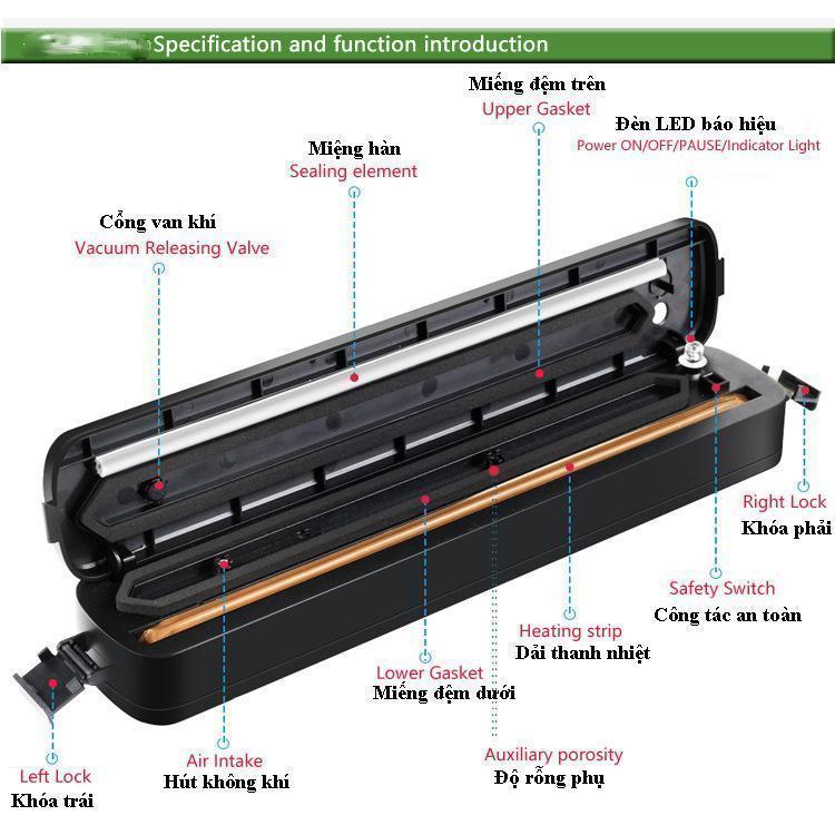 Bước 2: Cài khóa hai bên nắp máy hút và bấm nút "nguồn" máy màu xanh sẽ tự động hút sạch không khí bên trong bao bì.