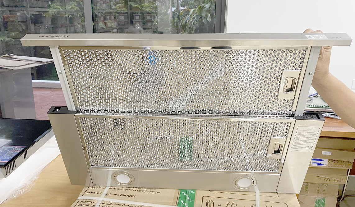 - Hệ thống lưới lọc 4 lớp inox hình tổ ong kết hợp 3 lớp lưới lọc Aluminium giúp giảm tiếng ồn và tăng hiệu quả thanh lọc dầu mỡ và mùi hiệu quả.