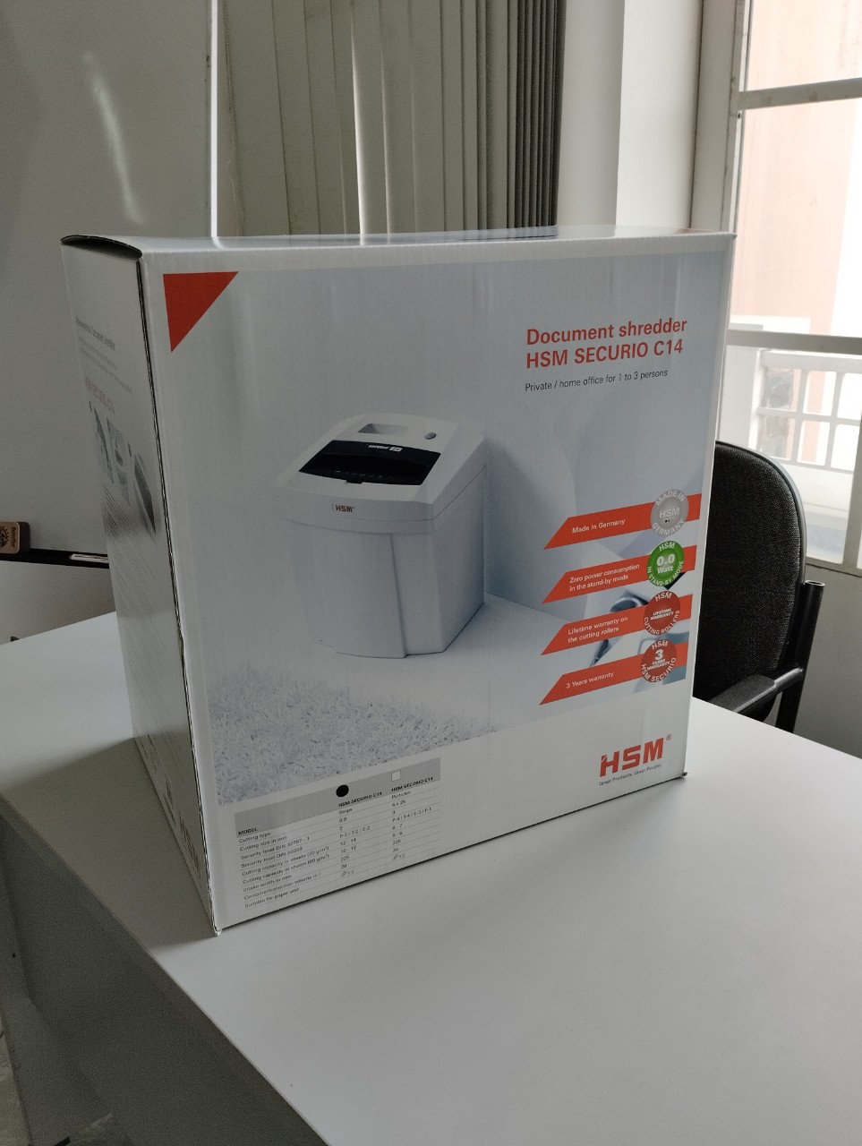 Máy hủy sợi HSM Securio C14 là một máy hủy tài liệu cỡ nhỏ dành cho văn phòng và hộ gia đình. Máy có kiểu hủy sợi, kích thước hủy 3,9 mm, có thể hủy