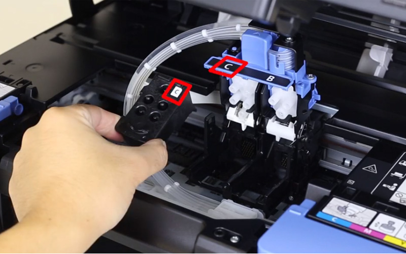 Sau khi bóc tem bảo vệ trên hộp mực, lắp hộp có ký hiệu "C" (hộp mực màu) và hộp có ký hiệu "B" (hộp mực đen) vào vị trí có ký hiệu tương thích, tránh va đập vào các vị trí xung quanh khi thao tác.