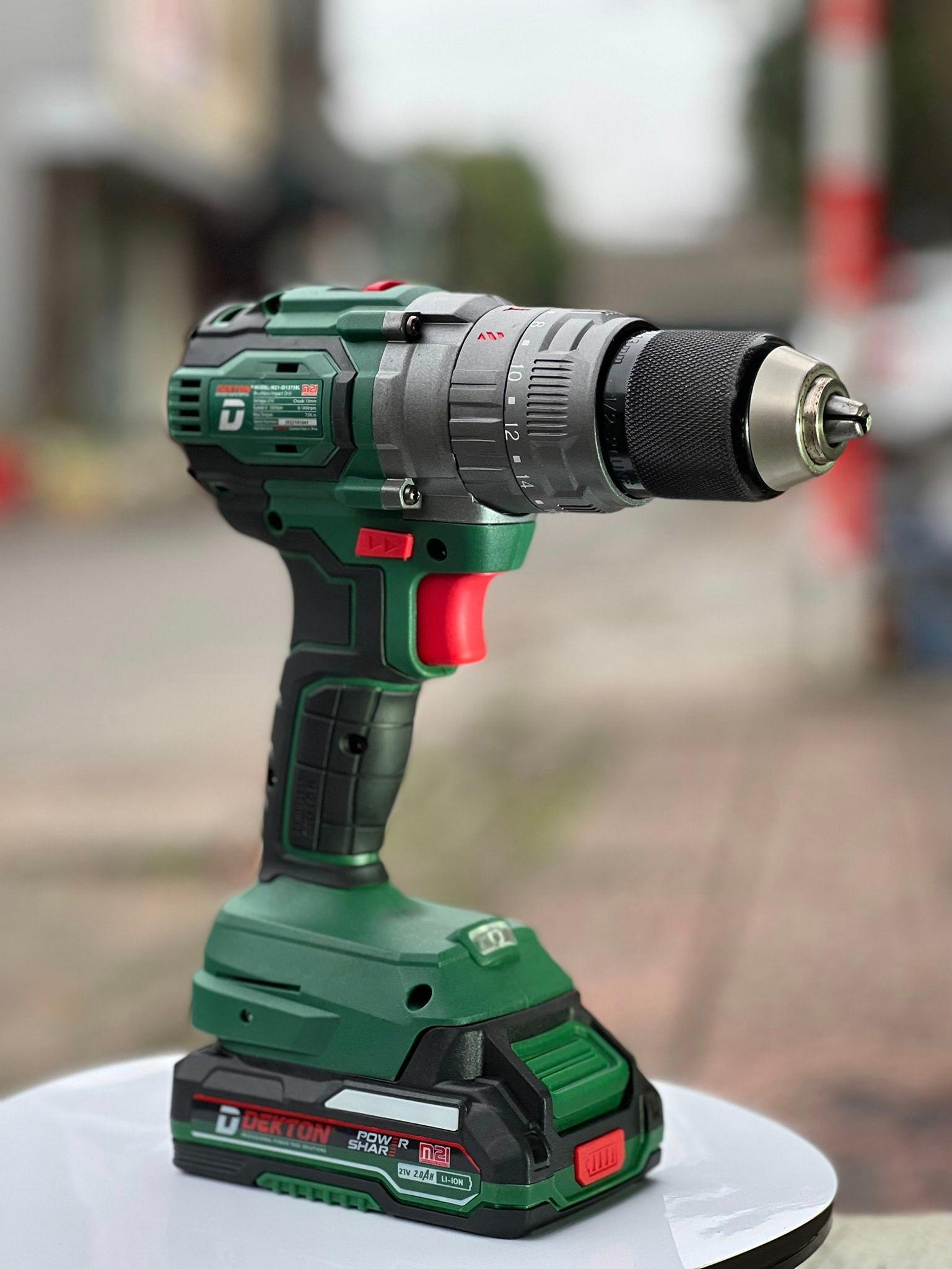 Thông số kỹ thuật -Model: M21-ID1375BL -Hãng: Dekton -Sản Xuất: Trung Quốc -Dung lượng pin: 21V / 4.0Ah -Loại pin: Li-ion -Máy gồm 2 pin -Đường kính mũi: 13mm -Tốc độ không tải: 400-2000vòng/phút -24 cấp độ trượt -Khả năng khoan gỗ: 28mm -Khoan thép: 13mm -Lực siết tối đa: 120 N -Trọng lượng: 2.2kg -Bảo hành 6 tháng