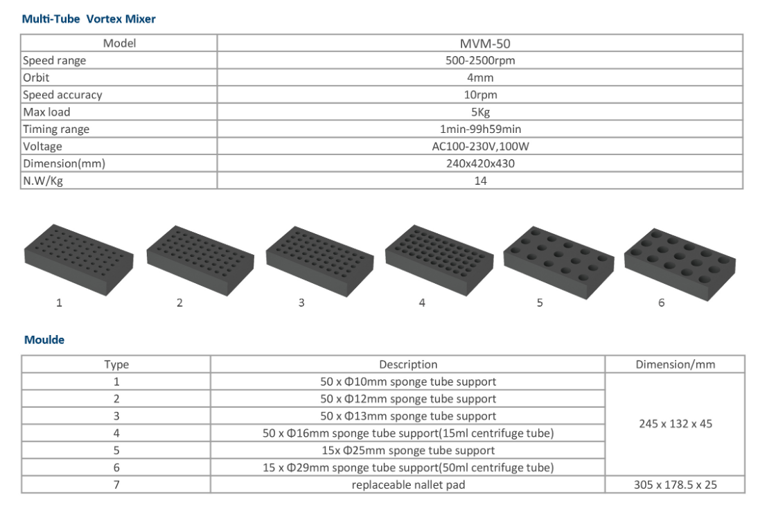 - Có thể lựa chọn nhiều phụ kiện khác nhau để đáp ứng nhu cầu trộn khác nhau. Ưu điểm: -Đèn LED hiển thị thời gian và tốc độ dao động, hoạt động đơn giản. -Động cơ DC không chổi than, hoạt động nhẹ nhàng, không ồn. -Chế độ lắc tăng dần, liên tục hoặc theo thời gian. -Xử lý tối đa 50 mẫu cùng một lúc để thí nghiệm hiệu quả hơn. Thông số kỹ thuật : Model: MVM-50 -Phạm vi tốc độ: 500-2500 rpm -Quỹ đạo: 4 mm -Tốc độ chính xác: 10 rpm -Tải tối đa: 5 Kg