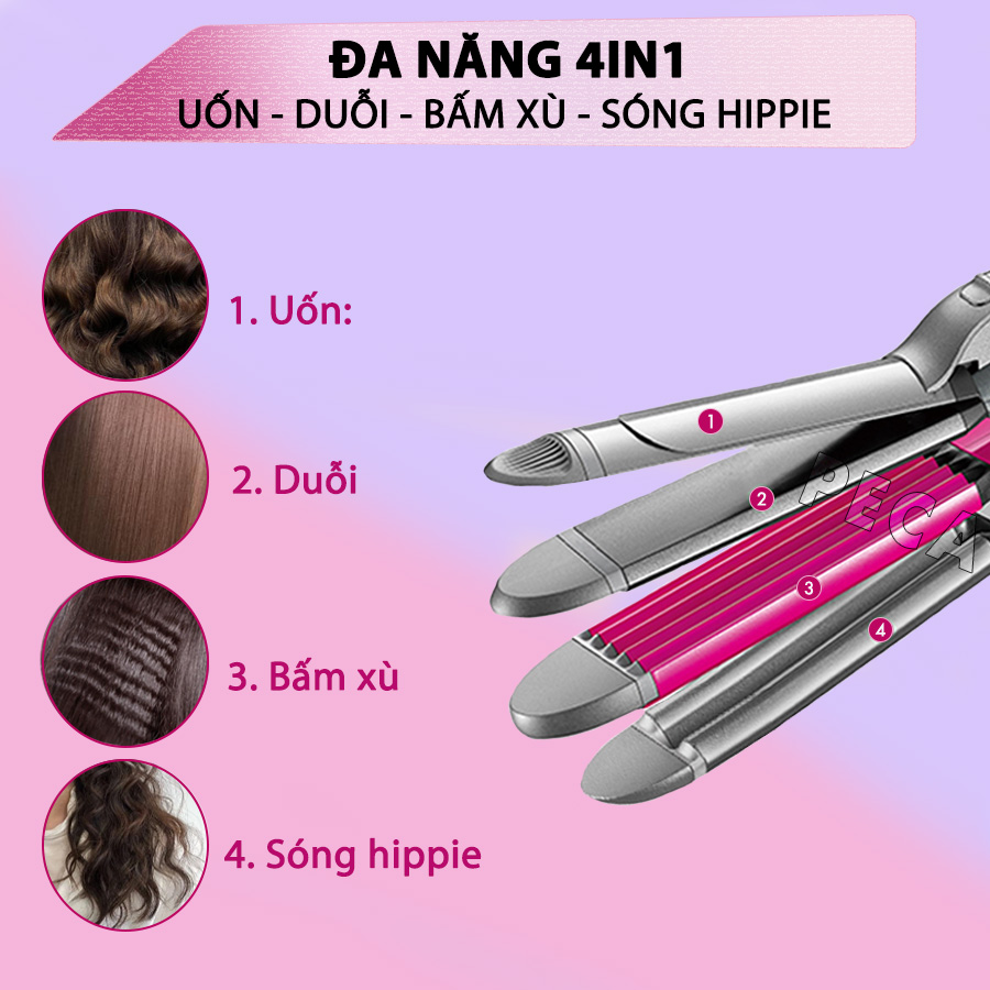 MÁY LÀM TÓC ĐA NĂNG 4IN1 KEMEI KM-1397 ĐIỀU CHỈNH 4 MỨC NHIỆT ĐỘ PHÙ HỢP VỚI MỌI LOẠI TÓC - HÀNG CHÍNH HÃNG   ƯU ĐIỂM NỔI BẬT: Chỉ cần thay đổi mái tóc trông bạn sẽ xinh đẹp lên rất nhiều,máy làm tóc KM-1397 chính là trợ thủ đắc lực của bạn. + Với chức năng 4 in 1 máy vừa có thể duỗi, dập xù và uốn cúp,uốn xoăn, tạo kiểu hippie ..tha hồ cho bạn sáng tạo các kiểu tóc yêu thích. + Với mức nhiệt độ phù hợp cho công việc làm tóc của bạn trở nên đơn giản và tiết kiệm thời gian hơn bao giờ hết. + Bạn sẽ có 1 mái tóc đẹp,xinh xắn và bồng bền chỉ trong vài phút,an toàn -tiện lợi mà giá cả lại hợp túi tiền.     CHI TIẾT SẢN PHẨM:   ️ Thiết kế đơn giản, chất liệu cao cấp, an toàn khi sử dụng. ️ Máy đa chức năng 4in1 có thể dùng để duỗi tóc thẳng, bấm xù tóc, uốn tóc, uốn sóng hippie... tạo kiểu tùy thích tích hợp trong 1 máy   ️ Nút ON/OFF, tăng/ giảm nhiệt độ thiết kế bấm linh hoạt dễ dàng thao tác   ️ Nóng nhanh 35s, nhiệt độ ổn định đúng mức nhiệt bạn đang điều chỉnh     ️ Có 4 mức nhiệt 140, 160,180, 200 độ C giúp bạn dễ dàng điều chỉnh phù hợp với mọi loại kiểu tóc.     ️ Dây điện dài 2m xoay 360 độ có móc treo cất giữ tiện lợi di chuyển thao tác linh hoạt     ️ Kích thước sản phẩm:  ️Thiết kế đơn giản với nút ON/OFF ️ Nhấn nút +/- để điều chỉnh nhiệt độ. Tăng/Giảm.   HƯỚNG DẪN SỬ DỤNG:    UỐN ( có thể uốn cụp, xoăn sóng nước...) - Chọn một lọn tóc nhỏ, kẹp phần đầu của lọn tóc - Cuốn lọn tóc bên ngoài ống, từ dưới lên - Giữ vài giây sau đó tháo lọn tóc  DUỖI THẲNG - Chuyển sang chức năng duỗi - Chọn một lọn tóc nhỏ, kẹp phần đầu của lọn tóc - Cuốn lọn tóc bên ngoài ống, từ dưới lên ️ DẬP XÙ/ HIPPIE - Chuyển sang chức năng dập - Chọn một lọn tóc nhỏ, kẹp và giữ vài giây