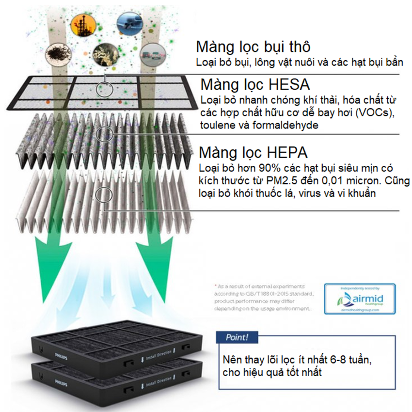 - Sử dụng công nghệ Airmax đời mới nhất của Philips, lọc 3 giai đoạn mạnh mẽ: Bộ lọc không khí xeon GoPure của Philips có hệ thống lọc không khí nhanh và hiệu quả. SelectFilter Plus 3 giai đoạn độc đáo loại bỏ tới 125 chất gây ô nhiễm có hại và khí thải, thông qua các lớp HEPA và HESA. Được chứng nhận độc lập bởi Airmid Healthgroup, công nghệ SelectFilter Plus cũng loại bỏ tới 90% các chất gây dị ứng phấn hoa trong không khí.