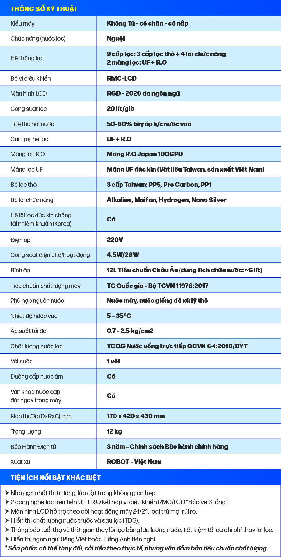 - Được trang bị thêm công nghệ vi điều khiển RMC-LCD thiết kế phát minh mới của ROBOT, hỗ trợ người dùng trực tiếp kiểm soát chất lượng nước trước & sau lọc, cảnh báo rủi ro trong quá trình sử dụng.