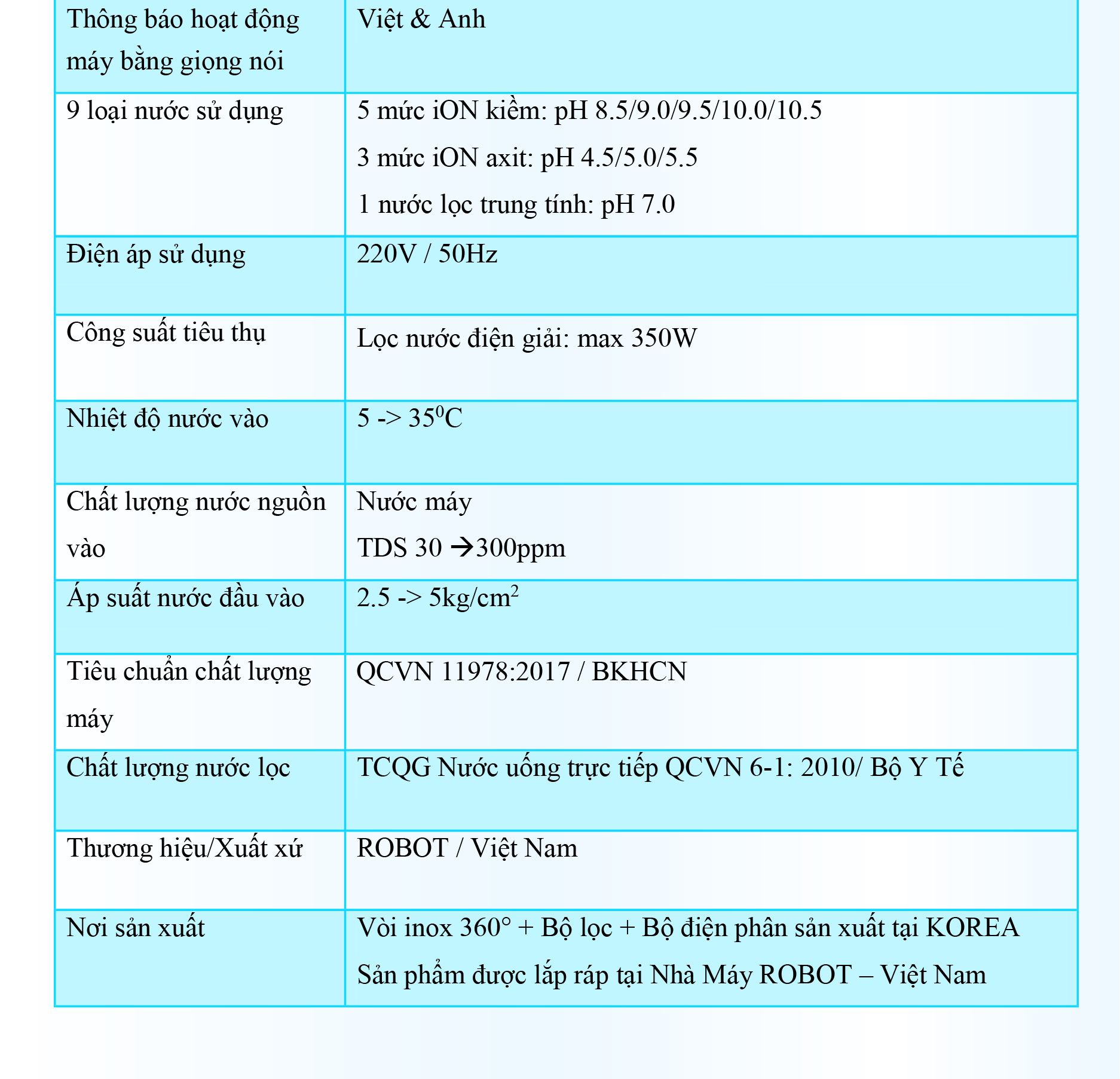 • Với mong muốn nhiều gia đình Việt có thể sử dụng nước điện giải iON kiềm với chi phí hợp lý để bảo vệ sức khỏe, sắc đẹp & nâng cao chất lượng cuộc sống, ROBOT mang đến sản phẩm “Chất lượng Quốc tế - Giá thành Việt Nam”, phù hợp với mức sống của nhiều người. Tiết kiệm cho người tiêu dùng đến hơn một nửa chí phí so với máy nhập khẩu chỉ từ 30 – 50%, nhưng sở hữu nhiều ưu điểm, tính năng vượt trội, chất lượng cao.