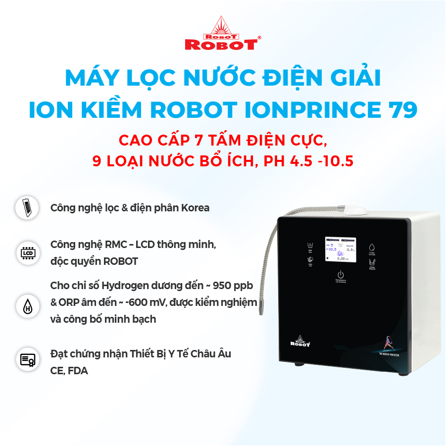 Máy Lọc Nước Điện Giải Ion Kiềm ROBOT IonPrince 79   ️ Máy lọc nước điện giải iON kiềm ROBOT ionPrince 79 là sản phẩm được sản xuất với công nghệ tiên tiến, cao cấp trang bị đến 7 tấm điện cực lớn nhất, có khả năng tạo ra đến 9 loại nước đa chức năng, với 5 mức nước iON kiềm (pH 8.5 – 10.5), nước lọc trung tính (pH 7.0) & 3 mức nước iON axit (pH 4.5 - 5.5). Chất lượng nước đạt chỉ số tối ưu, nồng độ Hydro hoạt tính lên đến ~800 -> 950 ppb, chống oxy hóa (ORP) lên đến ~ -400 -> -600 mV, đáp ứng mọi nhu cầu sử dụng trong cuộc sống. ️ Máy lọc nước điện giải iON kiềm ROBOT ionPrince 79 được thiết kế kiểu dáng hiện đại, thiết kế chinh phục mọi không gian. Đặc biệt, bộ sưu tập 5 sắc màu pastel hiện đại đáp ứng mọi sở thích và phong cách nội thất, chắc chắn sản phẩm sẽ là điểm nhấn đặc sắc trong ngôi nhà của bạn.           Máy lọc nước điện giải iON kiềm ROBOT ionPrince 79,