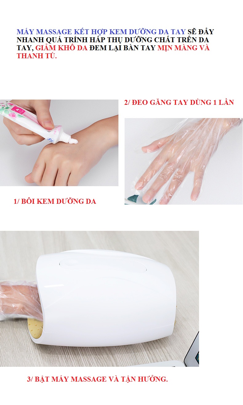 Máy massage bàn tay và cổ tay thúc đẩy quá trình tuần hoàn máu đến bàn tay, ngăn ngừa đau nhức tay ;tê bì, lạnh tay. Máy sử dụng pin sạc, 3 chế độ massage,