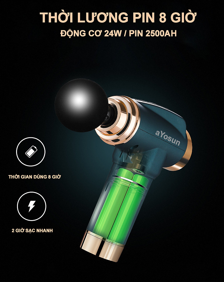 Máy massage cầm tay trị đau cơ bắp được trang bị pin lithium chất lượng cao với dung lượng 2500mAh cho thời gian sử dụng dài. Bạn có thể sử dụng mỗi ngày 30 phút trong suốt 15 ngày liên tục chỉ với 1 lần sạc. Máy mát xa cầm tay còn có đèn báo pin LED nên bạn không phải lo lắng về việc mất điện.