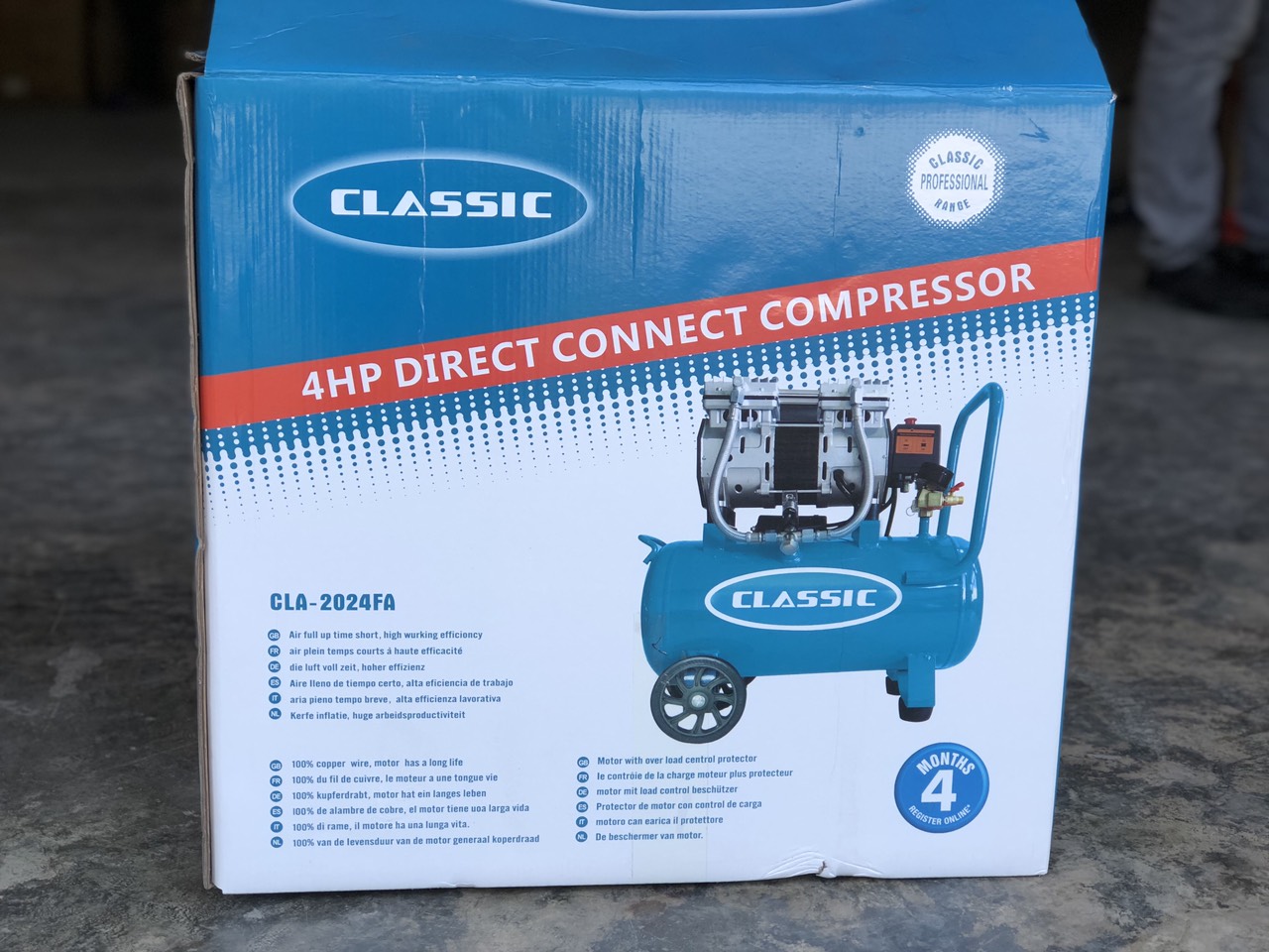 Máy nén khí Classic CLA-2024FA nổi bật với tính năng giảm ồn Classic CLA-2024FA là dòng máy nén khí mini với dung tích bình chứa khí là 24 lít. Máy nén khí Classic CLA-2024FA sẽ cung cấp khí nén cho máy phun sơn khí nén, máy vặn vít - bu lông khí nén hay nhiều máy móc sử dụng khí nén khác.  Máy nén khí Classic CLA-2024FA có trọng lượng nhẹ chỉ 20kg nên được thợ sơn, thợ cơ khí rất ưa chuộng. Áp lực khí nén là 8 bar, nạp khí nén cực nhanh với lưu lượng khí đạt 102 lít/phút.  Máy nén khí Classic CLA-2024FA có dung tích 24 lít Máy nén khí do thương hiệu Classic - Nhật Bản sản xuất nên độ bền cao, mẫu mã đẹp, khả năng lên hơi nhanh. Khí nén sinh ra có chứa ít dầu. Tuy nhiên lượng dầu ít nên không gây hại cho sức khỏe. Máy nén khí cũng là sản phẩm rất được các tiệm sửa xe máy quy mô nhỏ ưa chuộng.  Công suất hoạt động là 1500W giúp máy nén khí vận hành bền bỉ. Lớp sơn tĩnh điện bền màu, chống gỉ, chống rò rỉ điện. Khi vận hành máy nén khí có độ ồn cực thấp. Thông số kỹ thuật +Loại: Máy nén khí không dầu +Màu sắc: Xanh +Nguồn điện áp: 220V +Dung tích bình: 24 lít +Áp suất: 8 bar +Lưu lượng khí: 110 lít/phút +Công suất: 1500W +Trọng lượng sản phẩm: 20kg +Sản xuất tại: Trung Quốc +Thương hiệu: Nhật Bản