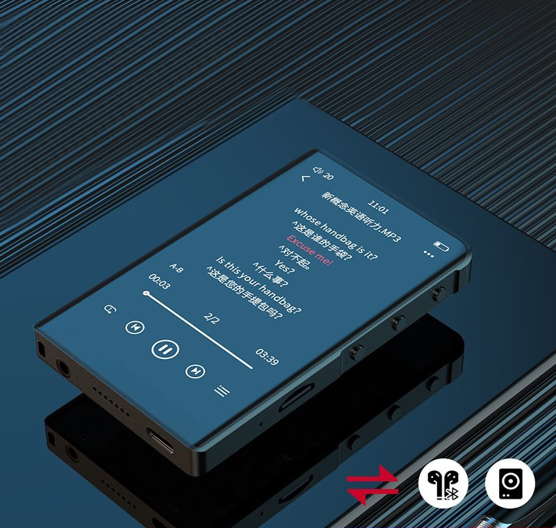 Máy nghe nhạc Ruizu X02B sử dụng công nghệ Bluetooth kết nối ổn định, hỗ trợ loa ngoài nghe nhạc, xem phim. Tính năng lặp đoạn A-B, thay đổi tốc độ phát hỗ trợ học