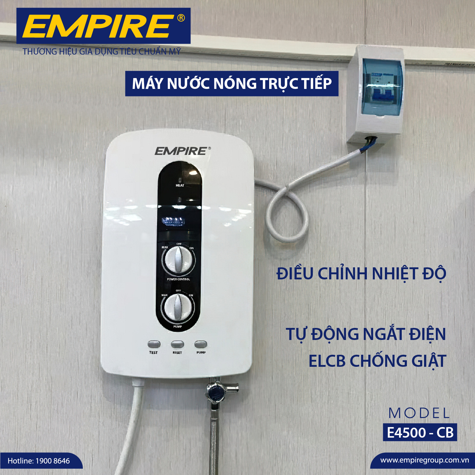 Máy nước nóng trực tiếp EMPIRE model: E4500-CB điện áp 220v công suất 4500W nhiệt độ làm nóng tối đa 55 độ Có bơm tăng áp tăng áp xuất nước ra cho tay sen. Có