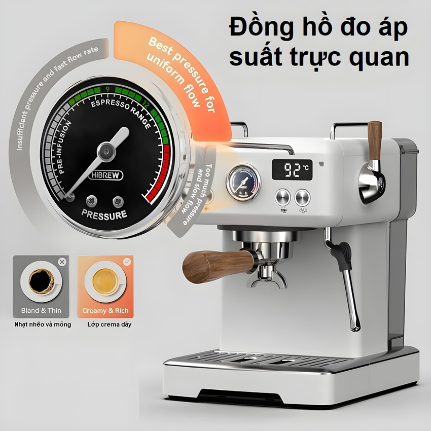 - Tích hợp đồng hồ áp suất giúp kiểm soát quá trình pha cà phê