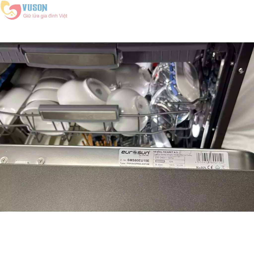 MÁY RỬA BÁT EUROSUN SMS80EU15E NHẬP KHẨU NGUYÊN CHIẾC TỪ CHLB ĐỨC VỚI THIẾT KẾ SANG TRỌNG CÙNG DUNG TÍCH CHỨA LÊN TỚI TRÊN 14 BỘ BÁT ĐĨA. AN TOÀN, BỀN BỈ VÀ TIẾT KIỆM