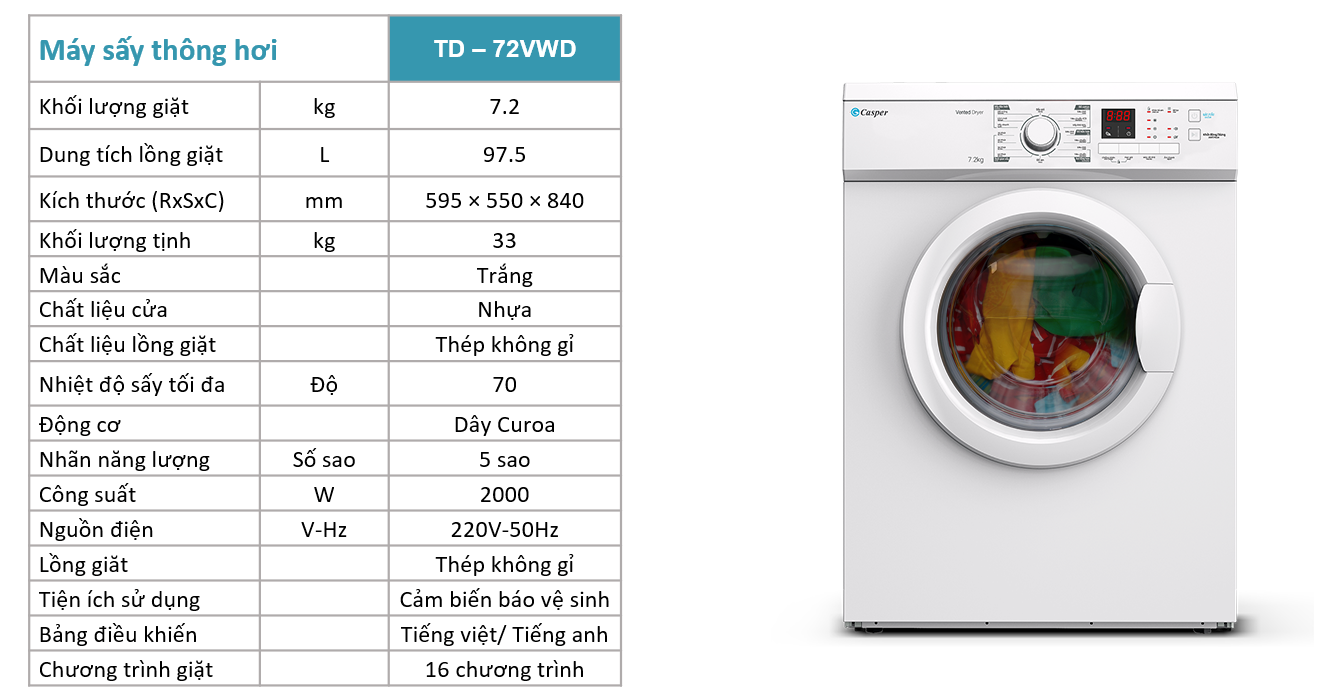 Máy sấy thông hơi Casper TD 72VWD 7 2kg #casper #maysayquanao #maysaythonghoi #maygiat