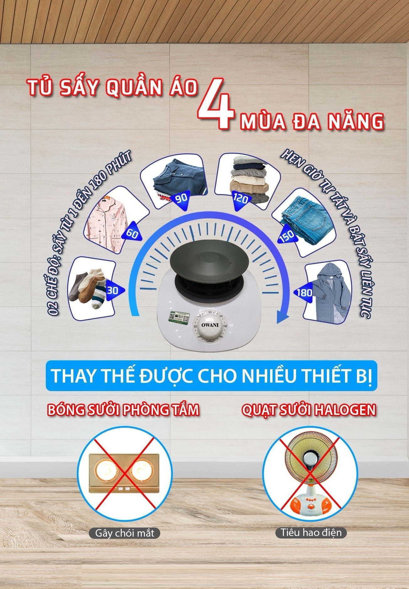 Sấy nhanh, Diệt khuẩn và mạt. Hai chế độ làm nóng PTC và gió nóng tuần hoàn 360° Thiết kế nhỏ, thuận lợi nhưng hiệu suất sấy cao. Có đèn UV để diệt khuẩn đạt