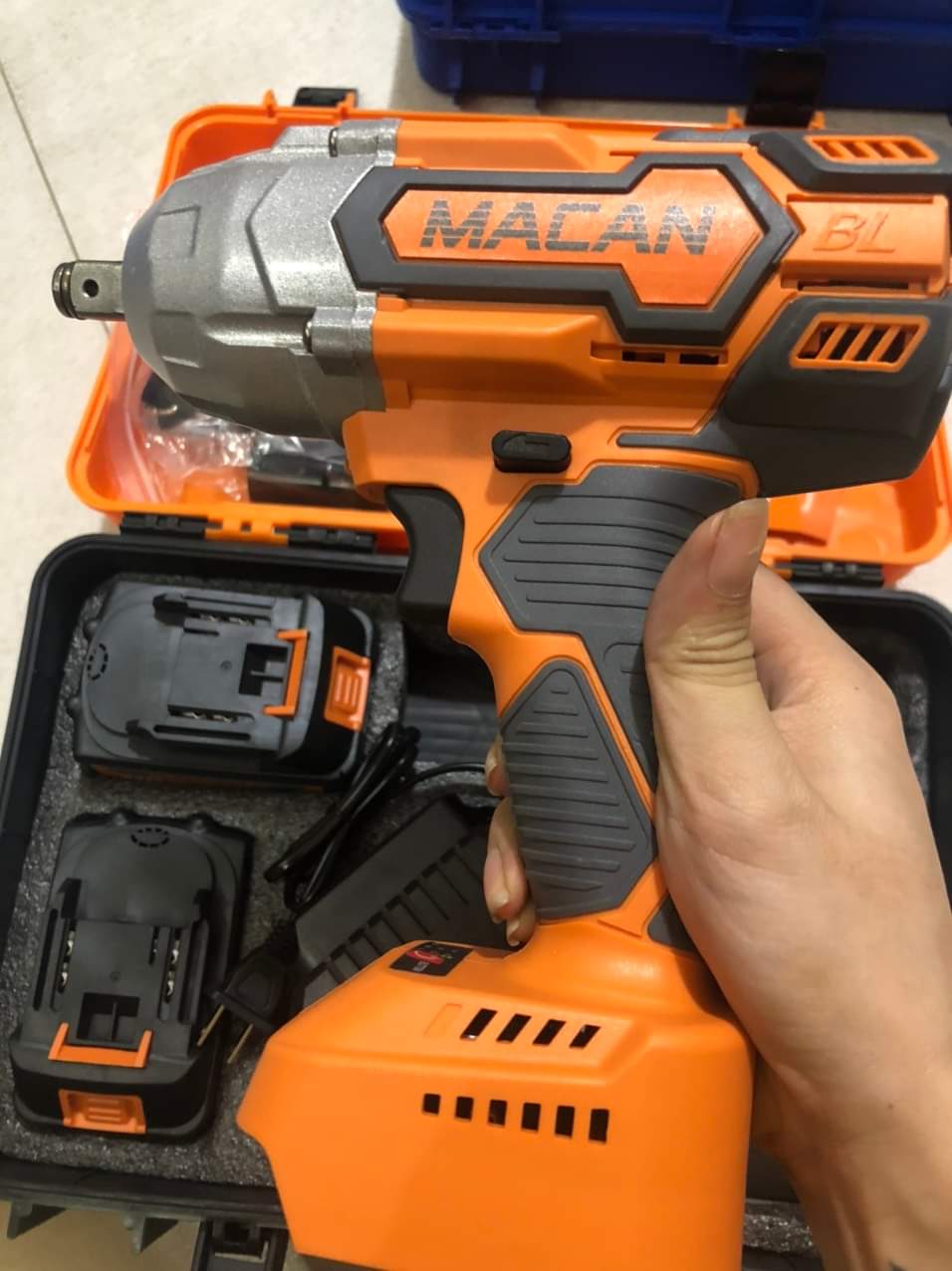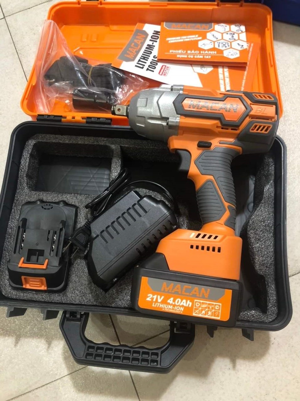 Phụ kiện bao gồm: 01 hộp máy, 01 thân máy, 02 pin 10cell, 01 sạc bàn pin tự ngắt khi đầy, 5 đầu khẩu, 1 đầu chuyển vít, 1 bộ chuyển khoan