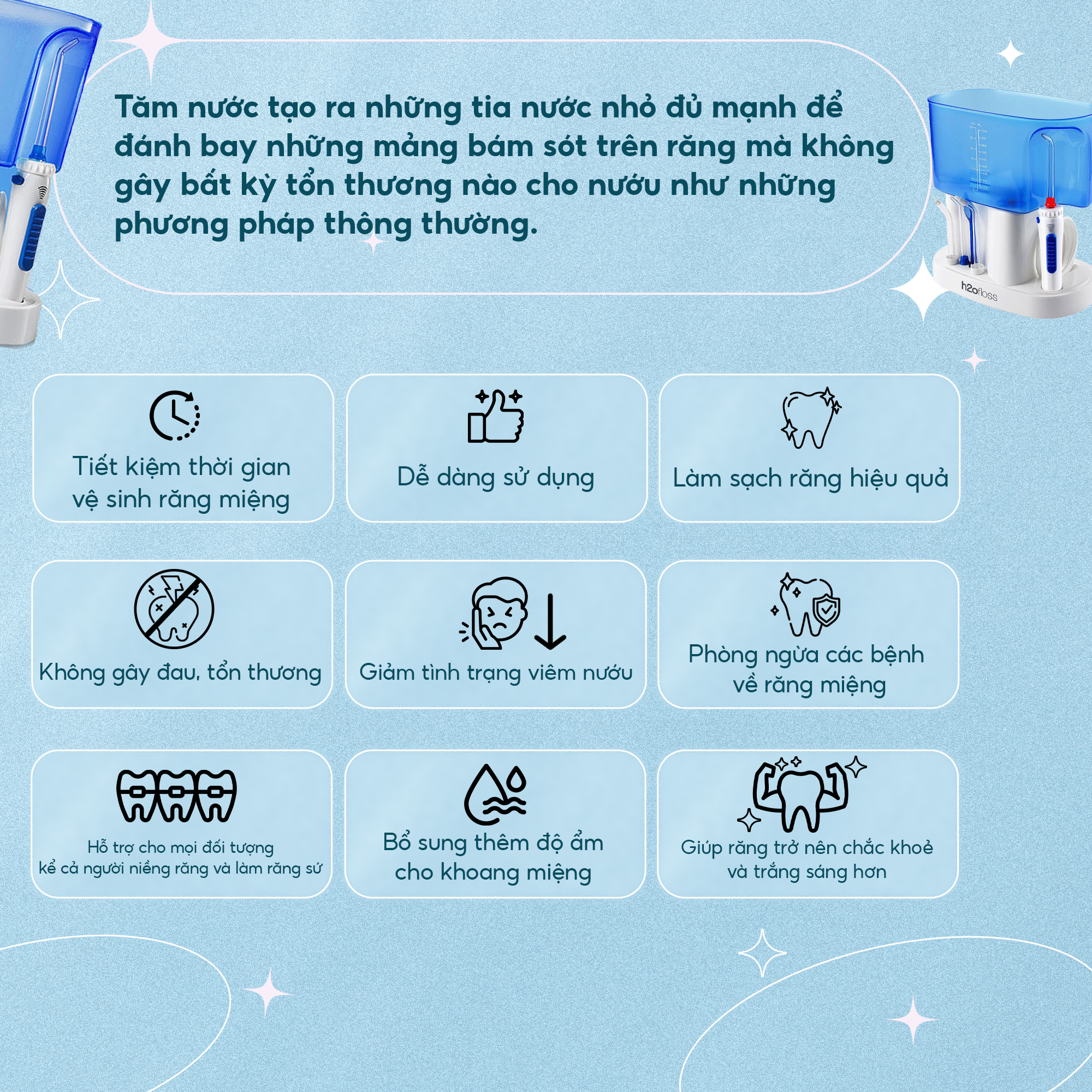 - Tăm nước không có tác dụng thay thế đánh răng, không thể thay thế chải răng. Nên sử dụng chung với bàn chải/bàn chải điện để có tác dụng tốt nhất