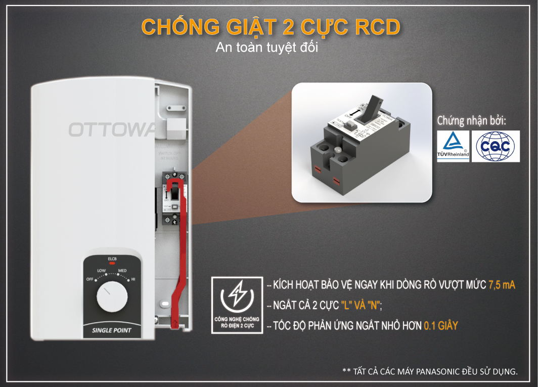 Sản phẩm cơ siêu bền và không bị ảnh hưởng độ ẩm cao trong nhà tắm. Được trang bị chống giật RCD an toàn tuyệt đối: được chứng nhận bởi TUV Rheinland và CQC Bầu