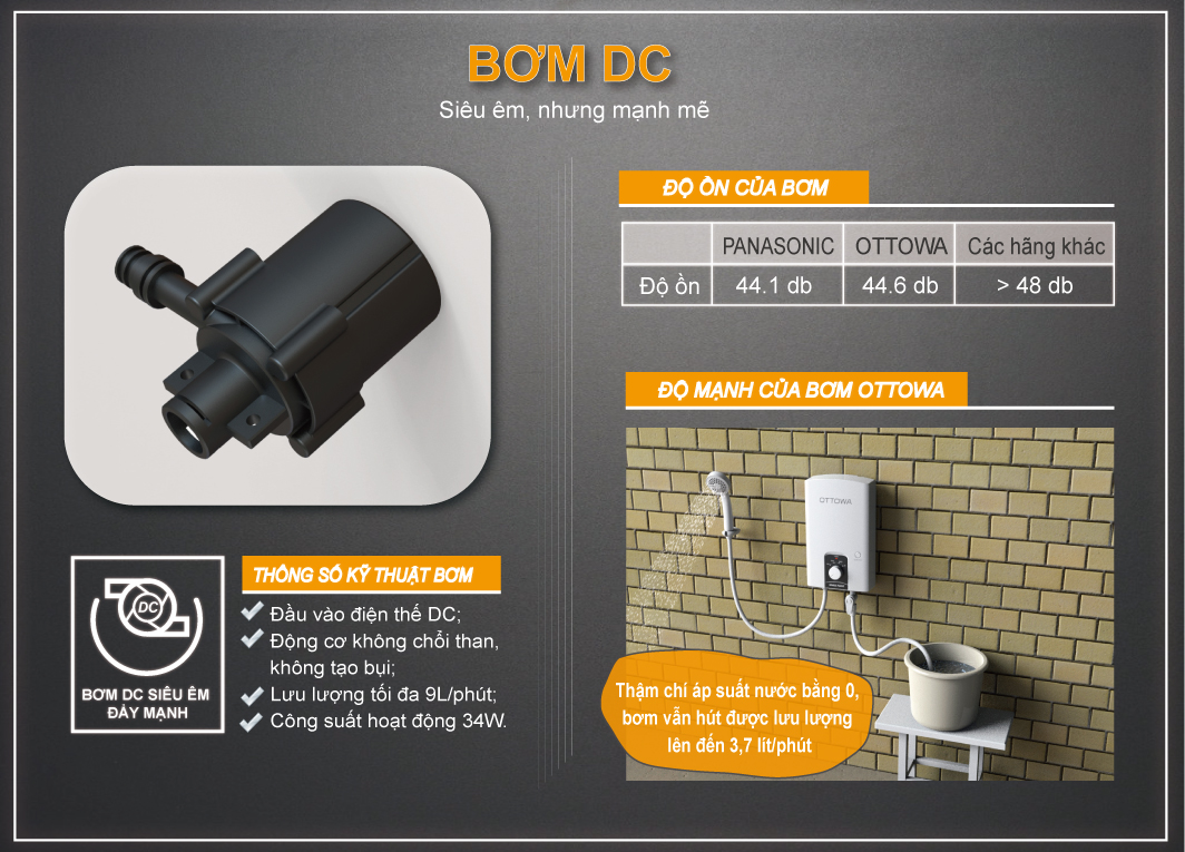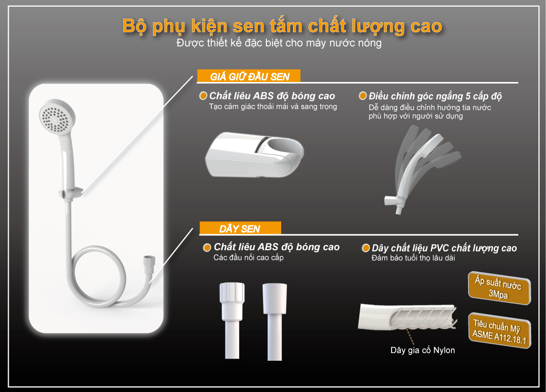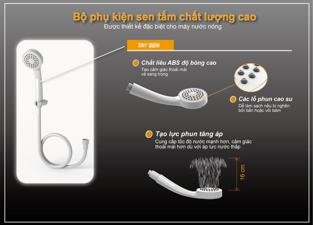 Mua tại TiktokSản phẩm cơ, bền và không lo độ ẩm: Toàn bộ hệ thống điều khiển là điều khiển cơ, không lo độ ẩm làm hư hỏng máy. Bơm 1 chiều DC, bơm khỏe, hoạt động êm ái, giúp tăng áp lực cho các nguồn nước có áp lực thấp Được trang bị chống giật RCD an toàn tuyệt đối: Công nghệ chống giật RCD an toàn tuyệt đối, không có mạch điện tử nên rất tin cậy Bầu đun lớn hơn, nhiều nước nóng hơn: Bầu đun được thiết kế lơn hơn, cho nước nóng nhiều hơn, đặc biệt không kén điện Sen tăng áp, tắm sảng khoái hơn: Sen tắm được thiết kế đặt biệt, giúp gia tăng áp lực dù áp đầu vào yếu, cho cảm giác tắm sảng khoái hơn Đạt cấp độ bảo vệ IP25 thật: Vỏ máy được thiết kế ôm sát phần thân sau, chống nước theo tiêu chuẩn IP 25 thật