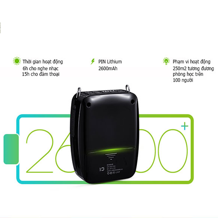 Với dung lượng pin lớn lên đến 2600mAh cho phép nói liên tục trong 20 tiếng, bạn không còn phải lo hết pin khi đang sử dụng, đảm bảo công việc hoạt động cho cả ngày của các giáo viên, giảng viên,...